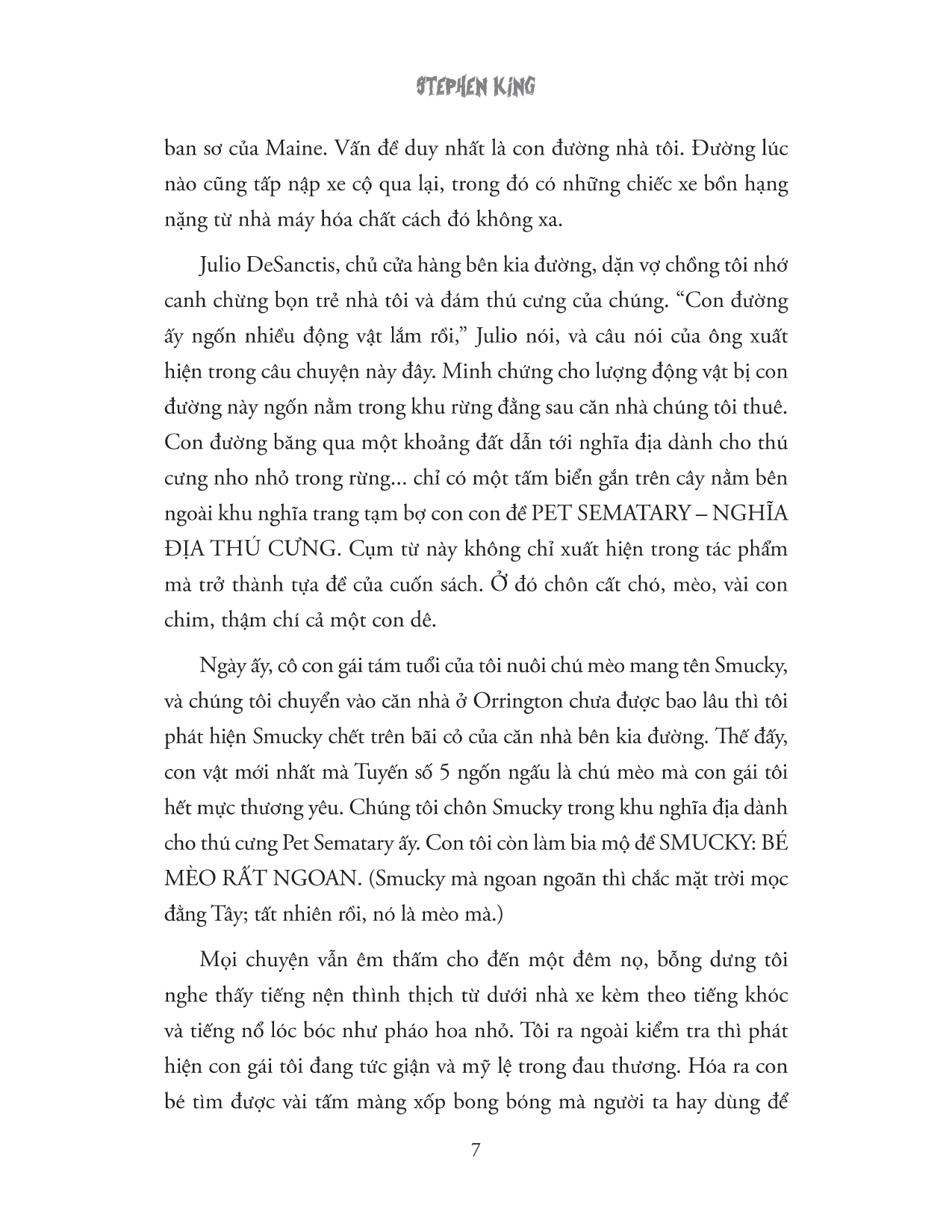 Pet Sematary - Nghĩa Địa Thú Cưng   Khi Tiến sĩ Louis Creed nhận một công việc mới và đã cùng cả gia đình chuyển đến thị trấn nông thôn bình dị ở Ludlow, Maine. Ngay cả khi đã yên ấm trong căn nhà mới, Louis vẫn không thể tin nổi khởi đầu tuyệt vời này đã trở thành sự thật. Bất chấp sự yên bình của vùng quê Ludlow, nơi đây vẫn tiềm ẩn một mối nguy đang rình rập. Những chiếc xe tải lao vun vút trên con đường phía bên ngoài ngôi nhà cổ xinh đẹp của Creed vì một điều…   Khu nghĩa địa tạm bợ trong khu rừng gần đó, nơi nhiều thế hệ trẻ em đã chôn cất những con thú cưng yêu quý của chúng.   Ngay sau đó, Louis liên tiếp nhận được những lời cảnh báo từ cả thực tế lẫn từ sâu thẳm trong cơn ác mộng của anh rằng anh đừng mạo hiểm vượt ra ngoài ranh giới của nghĩa địa nhỏ này, cũng là vị trí của một khu chôn cất khác với những lời hứa đầy hấp dẫn và ma mị.   Louis đã bước chân vào hành trình khám phá ra sự thật bị che giấu ấy – một sự thật còn đáng sợ hơn chính cái chết.   Về tác giả:   Stephen King là tác giả của hơn 60 cuốn sách, tất cả đều là những cuốn sách bán chạy nhất trên toàn thế giới. Các tác phẩm gần đây của ông bao gồm Fairy Tale, Billy Summers, If It Bleeds, The Institute, Elevation, The Outsider, Sleeping Beauties (viết chung với con trai Owen King), và bộ ba phim Bill Hodges: End of Watch, Finders Keepers và Mr. Mercedes (chiến thắng Giải thưởng Edgar cho Tiểu thuyết hay nhất). Cuốn tiểu thuyết 22/11/63 được The New York Times Book Review bình chọn là cuốn sách hay nhất của năm 2011 và giành được Giải thưởng Sách của Thời báo Los Angeles cho thể loại Bí ẩn / Kinh dị. Các tác phẩm The Dark Tower, It, Pet Sematary và Doctor Sleep của ông đã được chuyển thể thành phim, với It hiện là phim kinh dị có doanh thu cao nhất mọi thời đại. Ông là người đã nhận được Giải thưởng Thành tựu trọn đời của Hiệp hội Nhà xuất bản Âm thanh năm 2020, Giải thưởng Dịch vụ Văn học PEN Hoa Kỳ năm 2018, Huy chương Nghệ thuật Quốc gia năm 2014 và Huy chương của Quỹ Sách Quốc gia năm 2003 cho những đóng góp xuất sắc cho nền văn học Hoa Kỳ. Anh sống ở Bangor, Maine, với vợ, tiểu thuyết gia Tabitha King.   Đánh giá về cuốn sách   Hai lần được chuyển thể thành phim (1989 và 2019). Pet Sematary bản 1989 được đánh giá là một trong những phim kinh dị "cult culture" (những bộ phim không được giới phê bình đánh giá cao, không có doanh thu lớn, không được công chúng yêu thích, nhưng được một nhóm nhỏ yêu thích cuồng nhiệt). Nhận được tận 6,6 điểm trên IMDb, có số lượng DVD bán ra rất chạy, và được nhắc đến nhiều trong các bộ phim khác. Đây là một trong những tiểu thuyết kinh dị xuất sắc và mang tính biểu tượng nhất của Stephen King.   “Hoang dại, rùng rợn và gây bấn loạn” là những tính từ mà tờ The Washington Post Book World đã dùng để miêu tả về cuốn sách bán chạy số 1 theo bình chọn của New York Times này.   Một thước phim hành động nghẹt thở! Một trong những tiểu thuyết kinh dị xuất sắc và mang tính biểu tượng nhất của Stephen King.   “Cuốn tiểu thuyết đáng sợ nhất của Stephen King.” —Publishers Weekly   “Một tác phẩm gây choáng vá King đã khiến chúng ta phải tin những điều không tưởng.” —Detroit News   “Day dứt, cuộn trào, thuyết phục và đầy ấn tượng!” —Pittsburgh Press