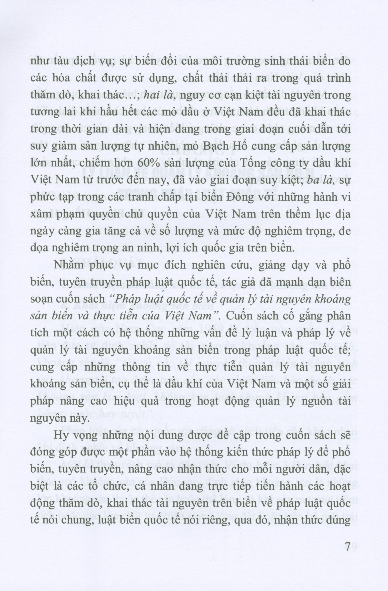 Nhằm phục vụ mục đích nghiên cứu, giảng dạy và phổ biến, tuyên truyền pháp luật quốc tế, tác giả đã mạnh dạn biên soạn cuốn sách "Pháp luật quốc tế về quản lý tài nguyên khoáng sản biển và thực tiễn của Việt Nam Cuốn sách cố gắng phân tích một cách có hệ thống những vấn đề lý luận và pháp lý về quản lý tài nguyên khoáng sản biển trong pháp luật quốc tế; cung cấp những thông tin về thực tiễn quản lý tài nguyên khoáng sản biển, cụ thể là dầu khí của Việt Nam và một số giải pháp nâng cao hiệu quả trong hoạt động quản lý nguồn tài nguyên này.