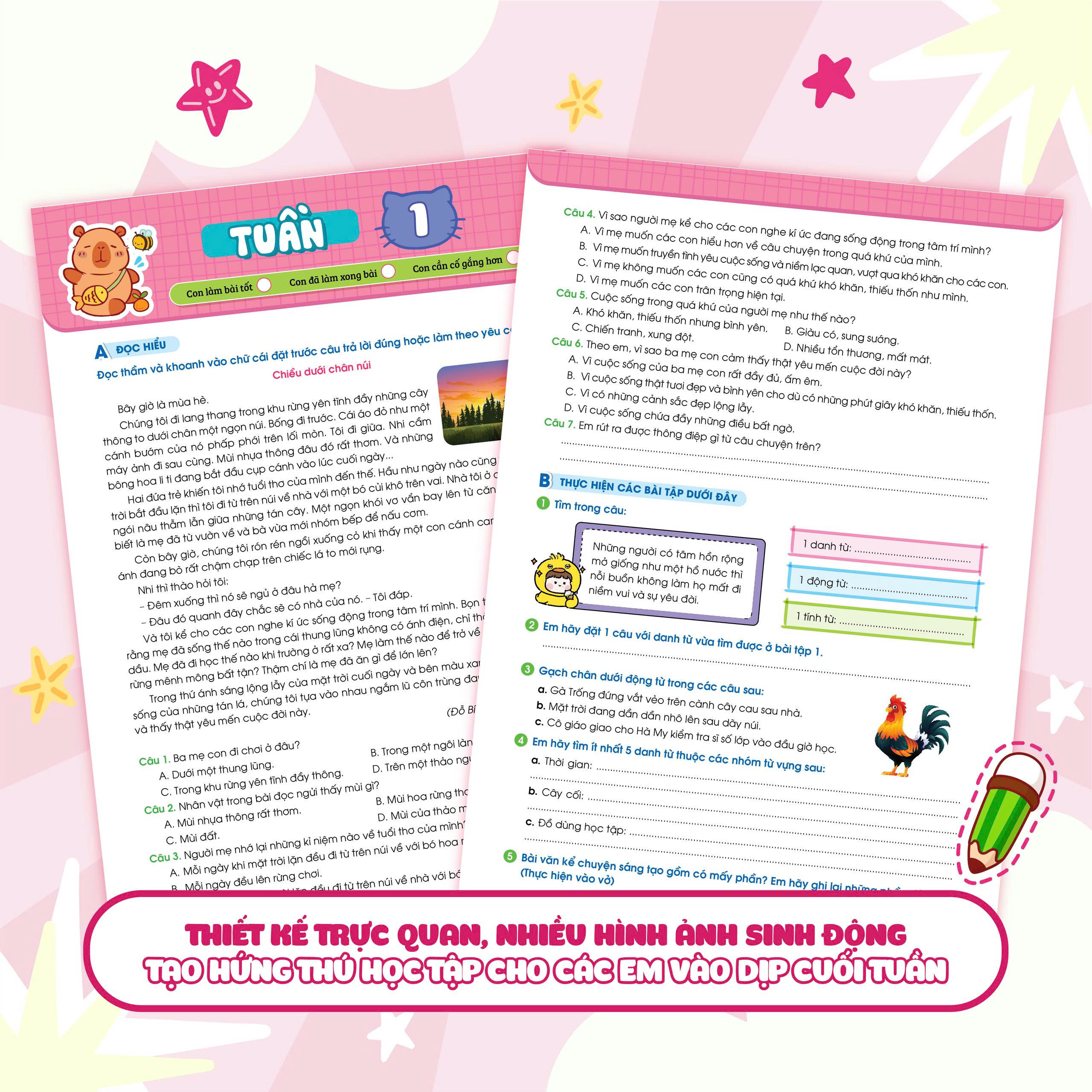 3. Hệ thống các bài tập phong phú, mang tính tổng hợp và ôn luyện toàn diện. Hệ thống bài tập đa dạng, lượng phù hợp với việc học cuối tuần để các con vẫn có thời gian thư giãn và vui chơi. Đặc biệt, sau mỗi kì sẽ có bài ôn tập giữa kì và cuối kì giúp con có tài liệu ôn tập cho các kì kiểm tra.