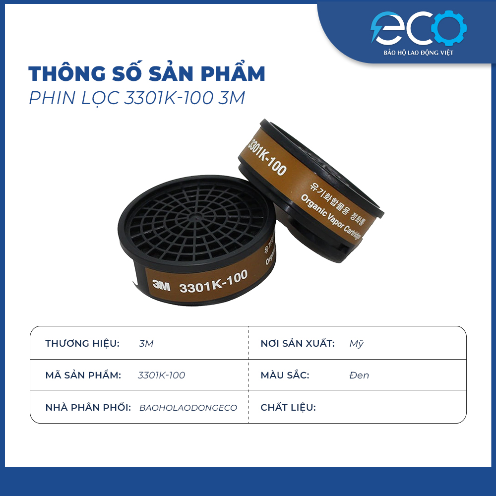 - Phin lọc 3M 3301K-100 (lọc hơi hữu cơ, hóa chất, sơn, thuốc trừ sâu) Chức năng: Lọc hơi hữu cơ, sơn PU, keo dán, dung môi công nghiệp, thuốc trừ sâu Chất liệu: Than hoạt tính cao cấp, hấp thụ hơi độc hiệu quả Tương thích: Mặt nạ 3M 3100, 3200 Thời gian sử dụng: 30 - 40 giờ làm việc liên tục (tùy mức độ ô nhiễm)
