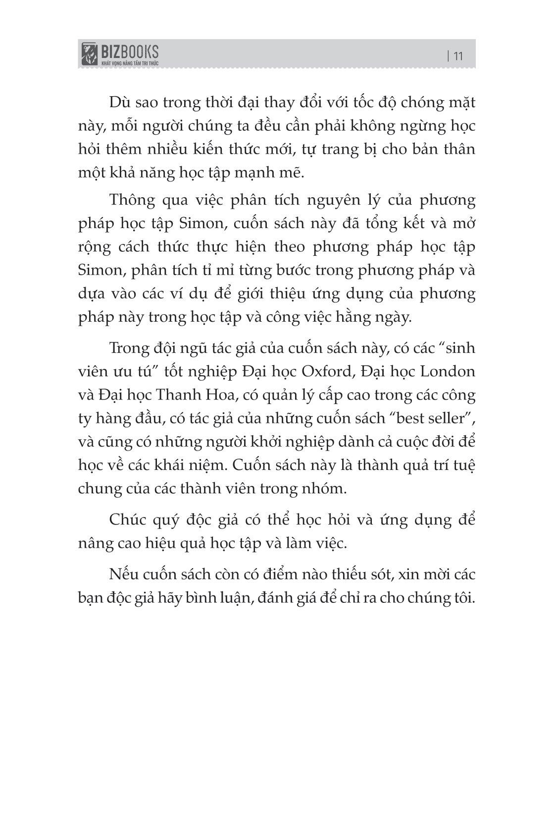• Phương pháp ghi chép CORNELL: Để ghi chép phát huy vai trò quan trọng Cuốn sách “Phương pháp Simon - Cách học nhanh, nhớ lâu mọi kiến thức” giúp cho bạn hiểu rõ hơn về phương pháp học tập bằng sơ đồ tư duy và cách sử dụng tối đa của não bộ. Không những vậy, cuốn sách cũng cung cấp các kỹ năng tư duy sáng tạo và năng lượng tập trung, giúp người đọc đạt được mục tiêu học tập của m.ình một cách nhanh chóng và hiệu quả Ngoài 6 chương chính, cuốn sách còn chỉ ra nhiều phương pháp học tập hay, những ví dụ đầy thực tế giúp bạn trở thành những người tự học, tự quản lý và đạt được thành công trong học tập và sự nghiệp của m.ình. Hy vọng cuốn sách này sẽ giúp bạn thu thập được nhiều thông tin hay để gặt hái được nhiều thành quả trong việc học. Bizbooks thân mời độc giả đón đọc!