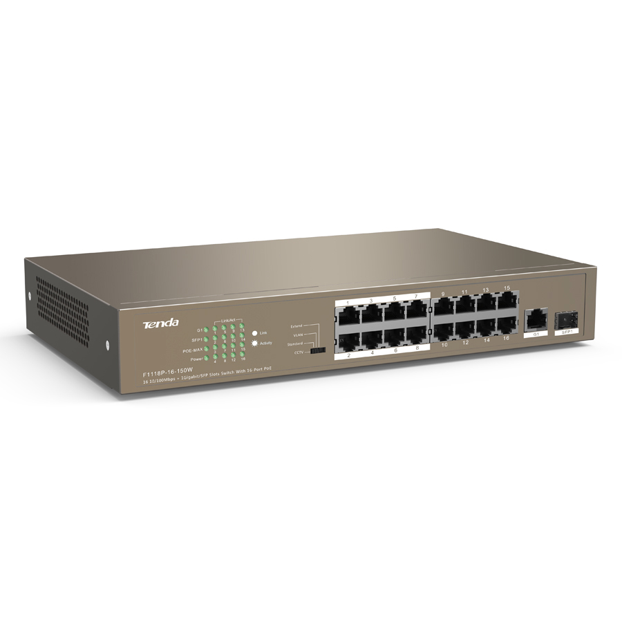 Thiết kế cung cấp giải pháp đơn giản PoE Switch Tenda TEF1118P Thiết kế đặc biệt nhằm cung cấp giải pháp đơn giản để mở rộng mạng SMB và mạng campus với chi phí tiết kiệm nhất, với 16 cổng PoE được trang bị 18 cổng mạng với cổng 1-16 tuân thủ chuẩn IEEE 802.3at/af.