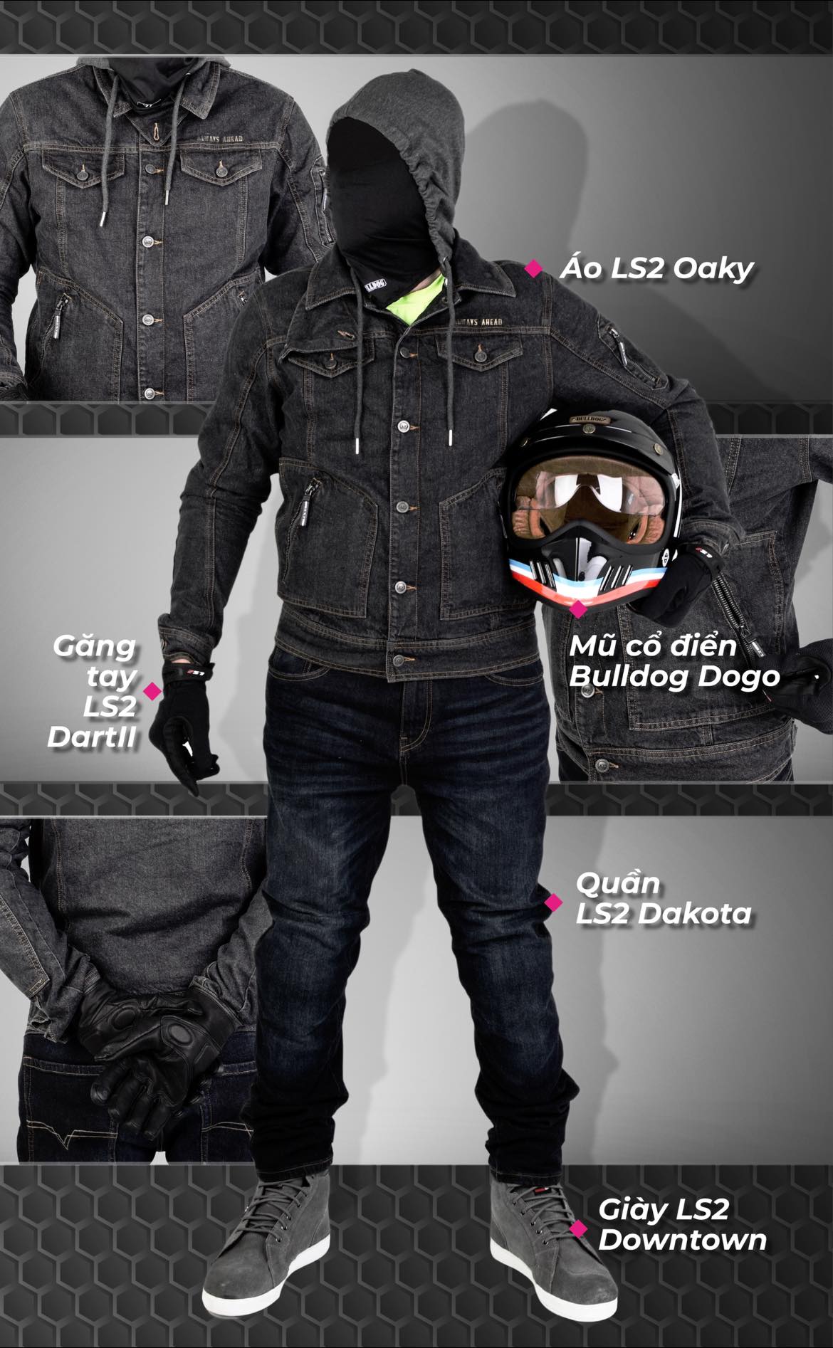 • Phù hợp dùng chung áo Jean LS2 Oaky đi phố hằng ngày, hoặc áo LS2 Airy/ Alba/ Riva/ Norway để đi đường dài.