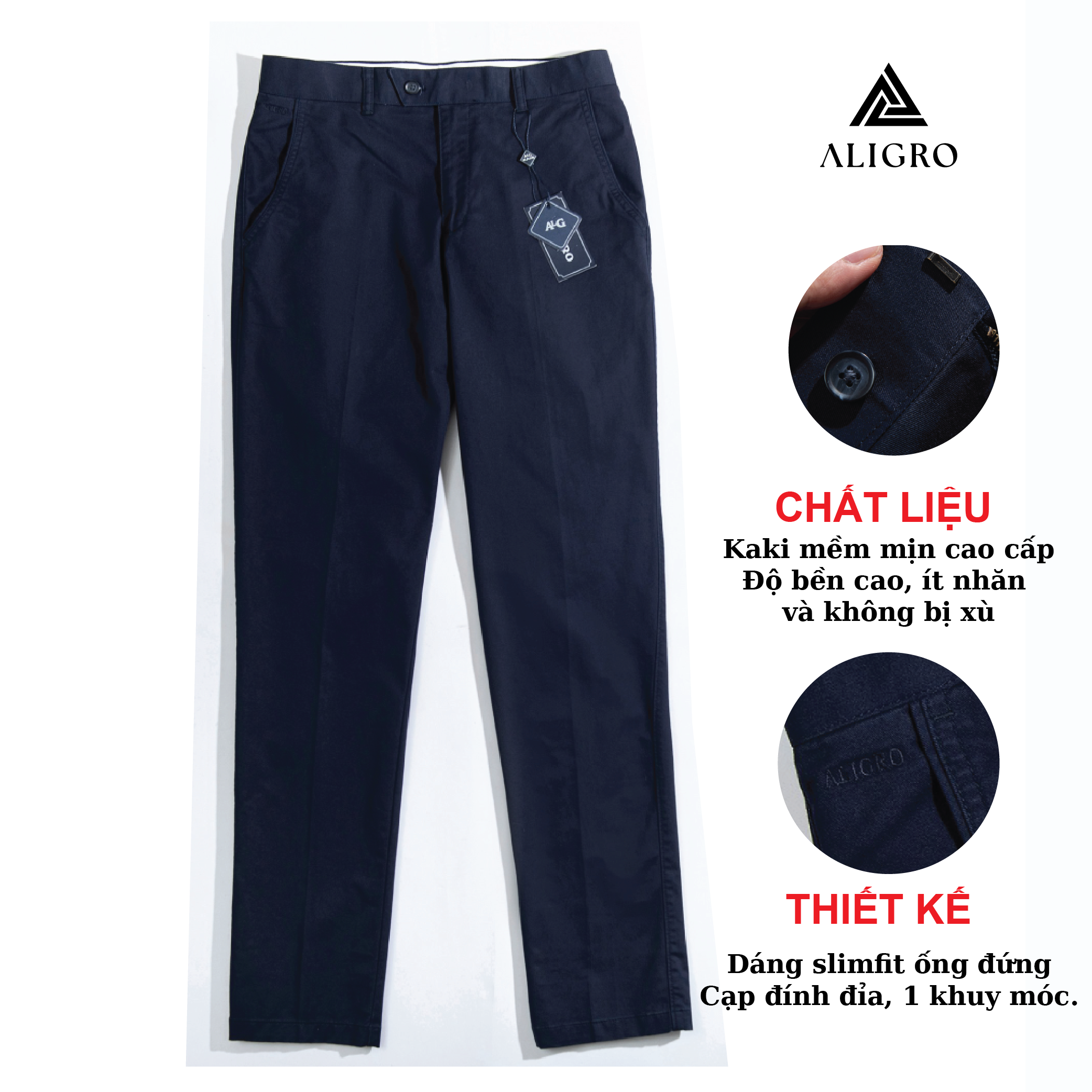 Mua tại TiktokGIỚI THIỆU THƯƠNG HIỆU Mang trong mình tầm nhìn chiến lược trở thành thương hiệu “Thời trang nam được yêu thích nhất Việt Nam” nên Aligro luôn chú trọng nghiên cứu phát triển mẫu mã, phom dáng phù hợp với vóc dáng hình thể đàn ông Việt. Sản phẩm của chúng tôi mang tới hình ảnh trẻ trung, năng động, hiện đại mà không kém phần lịch sự, sang trọng - cam kết mang lại giá trị đích thực và một cuộc sống thịnh vượng hơn cho phái mạnh Việt. CHI TIẾT THIẾT KẾ QUẦN KAKI NAM ALIGRO