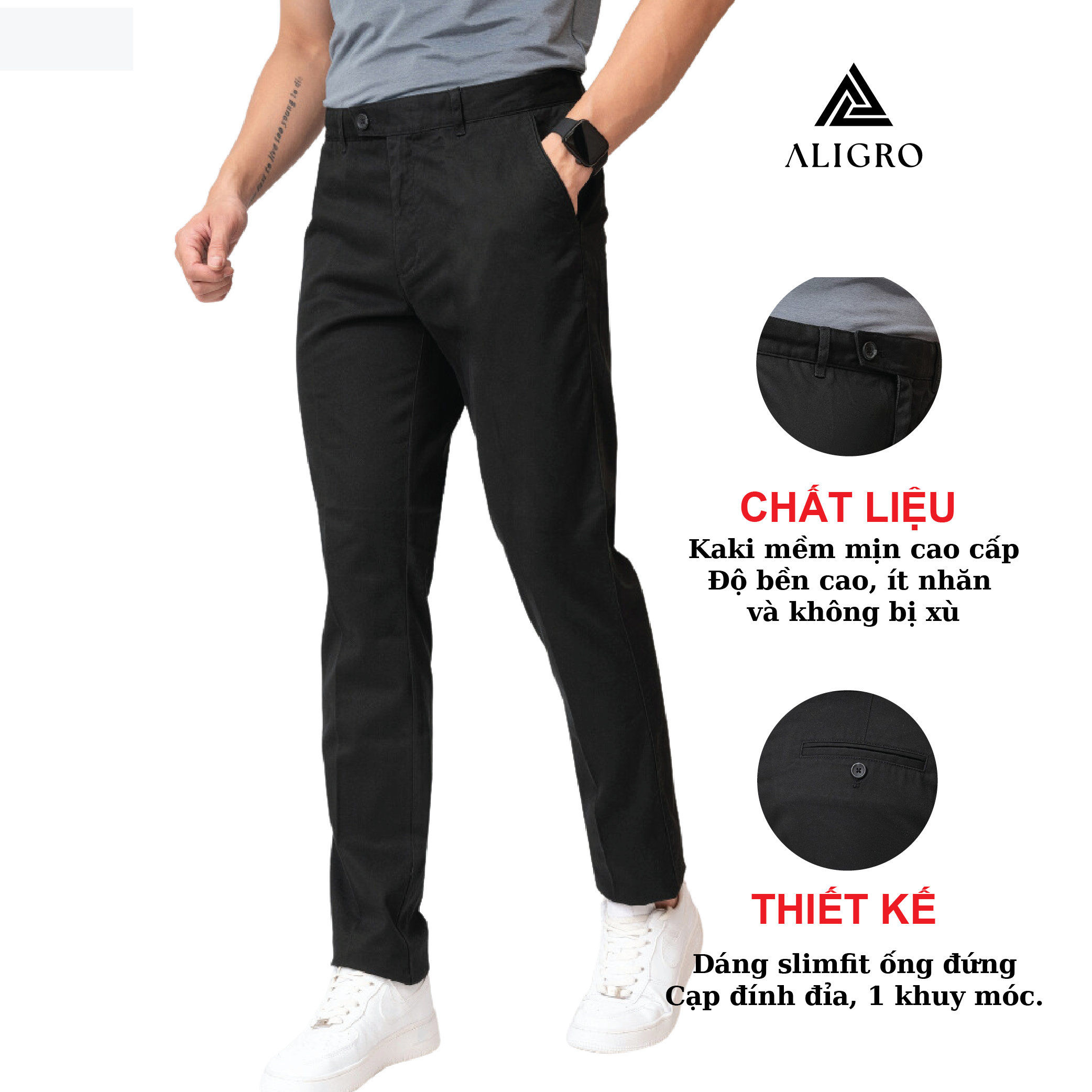 Mua tại TiktokGIỚI THIỆU THƯƠNG HIỆU Mang trong mình tầm nhìn chiến lược trở thành thương hiệu “Thời trang nam được yêu thích nhất Việt Nam” nên Aligro luôn chú trọng nghiên cứu phát triển mẫu mã, phom dáng phù hợp với vóc dáng hình thể đàn ông Việt. Sản phẩm của chúng tôi mang tới hình ảnh trẻ trung, năng động, hiện đại mà không kém phần lịch sự, sang trọng - cam kết mang lại giá trị đích thực và một cuộc sống thịnh vượng hơn cho phái mạnh Việt. CHI TIẾT THIẾT KẾ QUẦN KAKI NAM ALIGRO