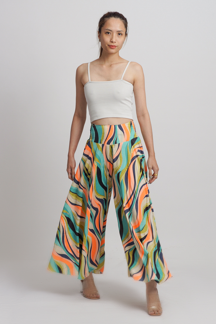 Quần Boho chất liệu lụa mềm mại, họa tiết ấn tượng. Bo thun co giãn ở lưng. Dây cột nơ ở eo (có thể cột phía trước hoặc sau eo). Phom rộng. Dài quần 105cm