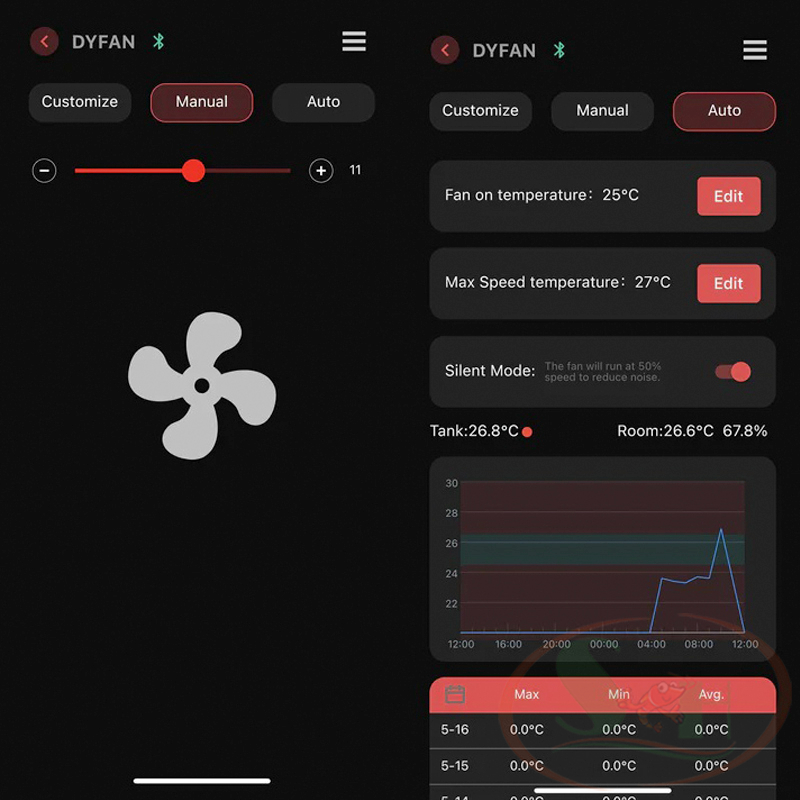 Quạt Chihiros Cooling Fan Bluetooth là sản phẩm tản nhiệt áp dụng công nghệ bluetooth từ Chihiros với hiệu suất cao, động cơ không chổi than, không tiếng ồn và vỏ hợp kim nhôm chống nước đạt chuẩn IP55. Chihiros Cooling Fan có thể làm mát nước một cách tiết kiệm và hiệu quả cao bằng cách sử dụng lượng không khí bốc hơi từ trong hồ. Chihiros Cooling Fan phiên bản Bluetooth được trang bị đầu dò nhiệt độ, có thể kiểm tra nhiệt độ nước. Cùng với cảm biến nhiệt độ và độ ẩm tích hợp giúp kiểm tra nhiệt độ và độ ẩm xung quanh. Chihiros Cooling Fan Bluetooth có thể cài đặt nâng cao thông qua chế độ AUTO, có thể điều chỉnh hẹn giờ tắt / mở hoặc điều khiển tốc độ của gió một cách tiện lợi, giúp giảm nhiệt độ trong bể từ 2 ~ 4 ℃. THÔNG SỐ KỸ THUẬT QUẠT CHIHIROS COOLING FAN BLUETOOTH: