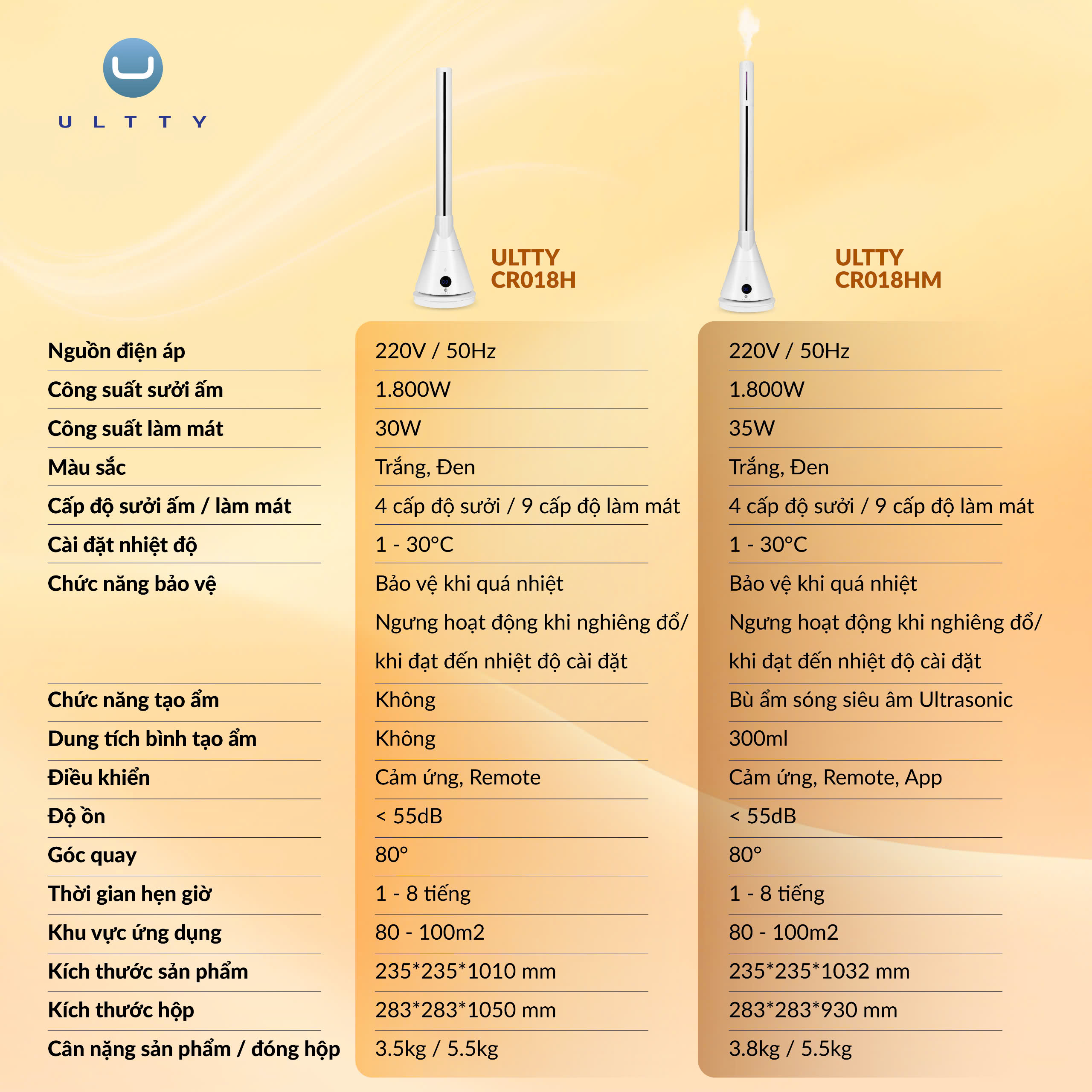 Mua tại TiktokULTTY CR018 HM new - Phiên bản mới của quạt tháp sưởi CR018 khi sẽ có nâng cấp thêm khoang bù ẩm, và kết nối được qua app Với chức năng 3in1 vừa sưởi ấm trong mùa đông, làm mát cho mùa hè tích hợp tính năng bù ẩm giúp duy trì độ ẩm lý tưởng cho không gian, đặc biệt hữu ích khi thời tiết hanh khô, bảo vệ sức khỏe hô hấp cho cả gia đình, trẻ nhỏ và người già. ULTTY CR018 HM nâng cấp khi có thêm bù ẩm hiện đại ULTTY CR018 HM nâng cấp khi có điều khiển qua app So sánh 2 dòng CR018H và CR018HM Các tính năng của quạt tháp sưởi 2 chiều ULTTY CR018 Một sản phẩm cho “Đông thêm ấm áp - Hè mát tuyệt vời” – Quạt tháp 2 chiều Sưởi ẩm và làm mát Ultty CR018 đang là sản phẩm rất được ưa chuộng trên thị trường bởi những tính năng vượt trội cùng thiết kế đầy tinh tế Chức năng kép độc đáo vừa sưởi ấm vào mùa đông và làm mát vào mùa hè Chức năng 2 chiều của quạt ULTTY đặc biệt hữu ích cho các gia đình. Thay vì phải sử dụng 2 sản phẩm máy sưởi cho mùa đông và quạt cho mùa hè , nay bạn chỉ cần một sản phẩm duy nhất. Chức năng sưởi ấm: