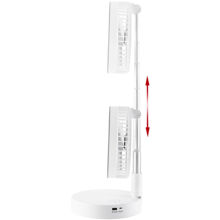 Quạt lồng có thể mở rộng với pin cho ở nhà và khi đang di chuyển Điều chỉnh độ cao linh hoạt, vô cấp của quạt từ khoảng 15 cm đến 75 cm Cơ chế gấp thực tế để lưu trữ tiết kiệm không gian Kiểm soát tốc độ 3 cấp Chế độ tự nhiên có thể chuyển đổi - thay đổi tốc độ quạt Can be used as a powerbank: Cho phép sạc các thiết bị di động như điện thoại thông minh, tai nghe, Góc nghiêng có thể điều chỉnh Hoạt động của pin tùy theo mức độ khoảng 4 - 10 giờ cơ sở ổn định đèn báo LED Bao gồm đèn đọc sách USB Công suất: 6,8W Điện áp/Dòng điện sạc: 5VDC/2A Pin: Pin Li-Ion 5.000 mAh Kích thước (WxDxH): xấp xỉ 19,7 x 19,7 x 9,5 cm. Khi mở: 19,7 x 19,7 x 39,9 cm Màu sắc: trắng/xám Trọng lượng: khoảng 0,9 kg Chất liệu: nhựa/nhôm Phụ kiện: Cáp USB, đèn đọc sách USB