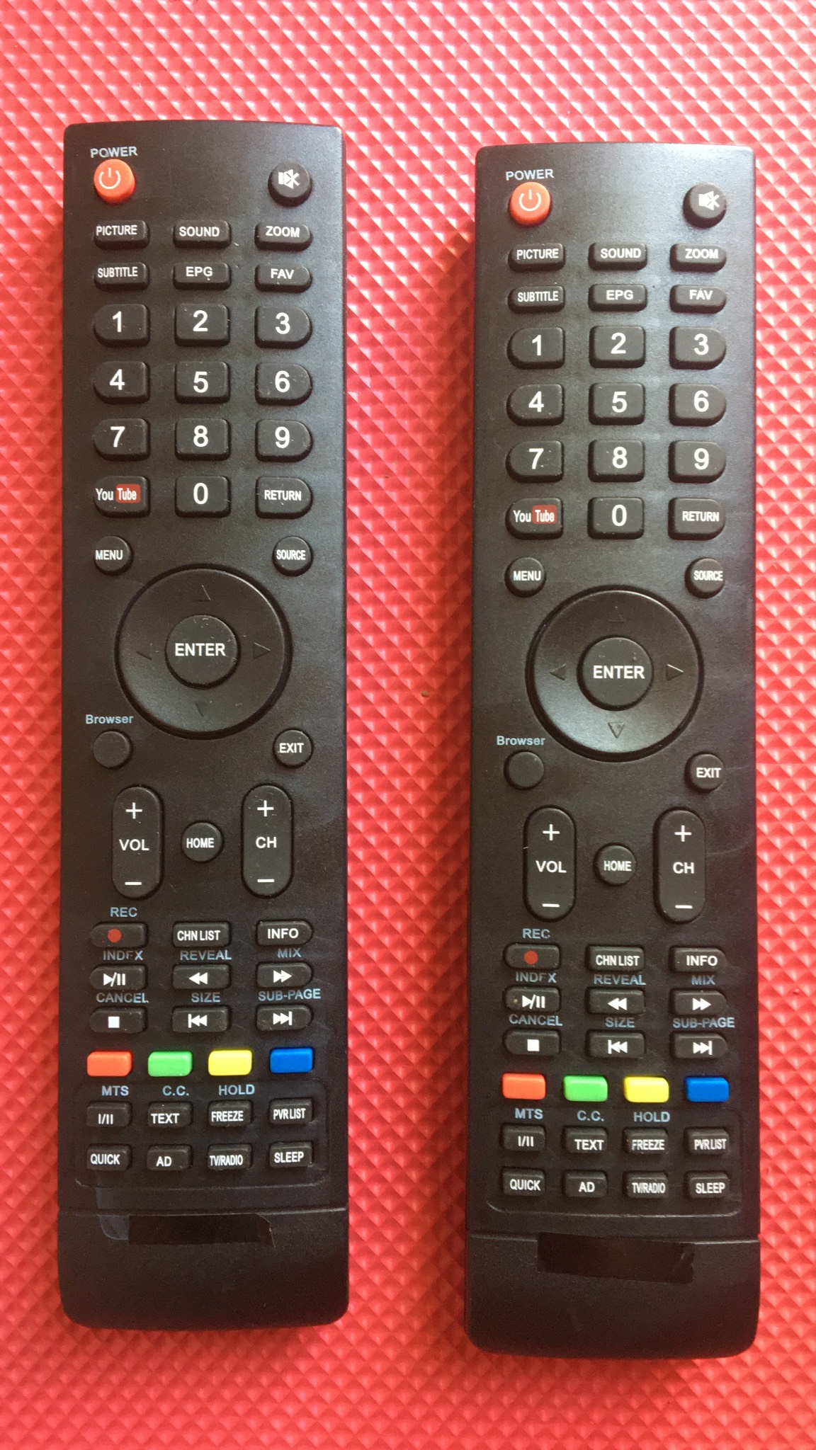 Hàng mới 100%, được PRC sản xuất với công nghệ tiên tiến Nguồn: 2 viên pin AAA Khoảng cách sử dụng: 8m Kích thước: 2415125mm Trọng lượng: 113g 1.POWER:Nhấn để bật tivi hoặc cho về chế độ chờ 2. MUTE:Nhấn để tắt tiếng hoặc bật tiếng tivi 3. PICTURE:Thay đổi chế độ hình ảnh trên tivi 4. SOUND:Thay đổi chế độ âm thanh trên tivi 5. ZOOM:Thay đổi tỷ lệ hình ảnh trên tivi 6. SUBTITLE:Bật/Tắt phụ đề ở chế độ DTV/USB 7. EPG:Nhấn để hiển thị thông tin EPG trên tivi Trong đó:EPG (Electronic Programme Guide) là giao diện đồ họa cung cấp thông tin trên màn hình cho khách hàng về danh sách các kênh truyền hình, thông tin chi tiết và ngắn gọn về các chương trình trên hệ thống. 8. FAV (Kênh yêu thích):Nhấn để xem các kênh yêu thích được bạn lưu lại. Nhấn các nút Lên/Xuống để chỉnh các kênh yêu thích, nhấn ENTER để xác nhận. 9.Các nút số dùng để dò kênh trực tiếp 10. CHN LIST:Nhấn để vào danh sách kênh 11.RETURN(BACK):Nhấn để quay trở lại kênh đã xem trướcHOẶC những bước đã thực hiện trước 12.MENU:Mở các tùy chọn cài đặt trong menu của tivi(Cho phép người dùng truy cập hệ thống danh mục lựa chọn như: cài đặt hình ảnh, cài đặt âm thanh, kênh, …) 13.SOURCE:Chọn chế độ nguồn đầu vào dữ liệu của tivi như: HDMI, MHL, USB, … 14. Lên/ xuống/ trái/phải:Di chuyển ô chọn 15. ENTER:Xác nhận việc chọn 16. TV/RADIO:Chuyển từ tivi sang đài phát thanh 17. EXIT:Thoát khỏi menu 18. VOL+/VOL-:Điều chỉnh tăng hoặc giảm âm lượng tivi 19.HOME:Nếu tivi của bạn không phải là Smart tivi, nút này sẽ không hoạt động.Vào giao diện trang chủ của tivi, bạn có thể lựa chọn tính năng mà bạn muốn sử dụng như Hình ảnh, Âm nhạc, Video, Trình duyệt, Thiết lập, … 20. PR+/PR-:Thay đổi kênh tivi muốn xem 21. REC:Nhấn để ghi âm chương trình hiện tại (Chỉ hoạt động ở chế độ DTV) 22. SLEEP:Chọn thời gian ngủ, chẳng hạn như 10 phút, 20 phút,… 23. INFO:Hiện thị thông tin về nguồn hiện tại. 26. NICAM:Nhấn để chọn đầu ra âm thanh mong muốn (Mono (Âm Đơn Sắc), Stereo (Âm thanh nổi), hoặc SAP) tùy thuộc vào kênh phát sóng. 29. PVR LIST:Hiển thị các danh sách tập tin ghi âm 30. QUICK:Nhấn để liệt kê một số cài đặt phổ biến để thay đổi nhanh chóng 32. 3D:Nhấn để tiếp cận chức năng 3D.Lưu ý:Nếu tivi không có chức năng 3D, nút 3D trên điều khiển sẽ không hoạt động và sẽ không được sử dụng