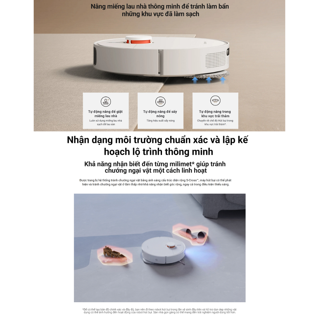 Tự động cắt tóc rối tại dock sạc (lần đầu tiên xuất hiện): Dock sạc tích hợp cải tiến công nghệ cắt tóc tự động, sau khi robot làm sạch xong và quay trở lại dock sạc. Lưỡi cắt sẽ quay với tốc độ 60 vòng/phút + di chuyển sang trái và phải để cắt, cắt bỏ hiệu quả phần tóc quấn quanh chổi lăn. Cuối cùng phần tóc vụn sẽ được hút vào bộp đựng bụi. Giải quyết hoàn toàn vấn đề tóc quấn vào chổi lăn gây rối khó tháo gỡ. Lưỡi cắt tóc bền bỉ: Nó được làm bằng thép không gỉ và đã trải qua quá trình thử nghiệm độ bền. Không chỉ cắt tóc ổn định, chính xác và nhanh chóng mà còn có thể sử dụng trong thời gian dài. Nhận diện thảm thông minh, không gây ướt thảm Robot Mijia M30 Pro nhận diện thảm một cách thông minh, tự động nâng cây lau nhà lên và tự động tăng mức hút, giúp bụi bẩn trên thảm được hút sạch tối đa mà không làm ướt thảm. Khi quay trở về giặt giẻ Mijia M30 Pro cũng sẽ tự động nâng khăn lau lên một cách thông minh để tránh làm sàn nhà bị ô nhiễm thứ cấp. Sử dụng cơ chế lau xoay được đánh giá cao Mô phỏng thao tác lau sàn bằng áp lực thủ công, xoay 180 lần mỗi phút ở tốc độ cao. Làm sạch mạnh mẽ các vết cà phê, vết nước tương và các vết bẩn cứng đầu khác trên sàn. Cơ chế lau xoay này cũng giúp việc làm sạch cạnh đạt hiệu quả cao hơn. Tích hợp Camera AI thông minh Camera AI thông minh có thể nhận dạng và xác định 55 loại vật thể như dép, tất, cân, đồng thời có thể linh hoạt tránh các vật thể khó vượt qua hoặc gây mắc kẹt. Ngoài ra, Mijia M30 Pro còn trang bị đèn LED nhìn đêm, có thể bật hoặc tắt thông minh theo ánh sáng xung quanh. Ngay cả trong môi trường ánh sáng tối, nó có thể xác định chướng ngại vật và bụi bẩn phía trước để làm sạch hiệu quả. Điều hướng bằng laser LDS, quét toàn bộ ngôi nhà 360° Hệ thống nhận dạng cảm biến S-Cross AIT 2.0, quét lập thể và xác định đường viền của các chướng ngại vật thấp, kết hợp với nhận dạng đối tượng AI. Đạt được độ chính xác nhận biết ở cấp độ milimet. Robot Xiaomi Mijia M30 Pro áp dụng công nghệ điều hướng laser tiên tiến quét 360°, nhanh chóng lên bản đồ, lập kế hoạch chính xác các đường dẫn dọn dẹp. (Tích hợp lưu nhiều bản đồ) Lực hút siêu khủng của M30 Pro lên đến 7000Pa Lực hút siêu khỏe 7000Pa hàng đầu có thể loại bỏ bụi một cách hiệu quả khỏi các khoảng trống trên sàn, thảm sâu và các khu vực khó làm sạch khác. Kết hợp cùng thuật toán nhận dạng bụi bẩn AI, làm sạch chính xác và kỹ lưỡng hơn. Cụ thể thuật toán AI xác định các hạt bụi bẩn khác nhau trên mặt đất theo thời gian thực. Hút lại thông minh giúp sàn nhà được làm sạch triệt để. Kết nối và điều khiển qua App Mi Home thông minh Điều khiển từ xa Mijia APP giúp việc vệ sinh dễ dàng ngay cả khi bạn không ở nhà. Hẹn giờ làm sạch thông minh khi bạn không có nhà. Khi bạn vắng nhà, bạn chỉ cần mở APP Mijia để bắt đầu công việc dọn dẹp từ xa. Nó hỗ trợ các chức năng tùy chỉnh như dọn dẹp theo lịch trình và cài đặt khu vực hạn chế. Một số tính năng khác