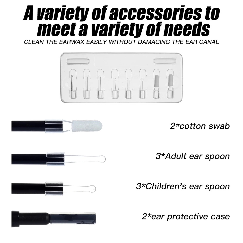Đi kèm camera là nhiều đầu lấy ráy tai bằng nhựa trong suốt, giúp bạn lấy ráy tai an toàn, dễ dàng mà không gây tổn thương tai.