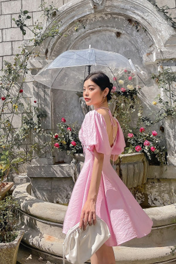 ღ THÔNG TIN SẢN PHẨM: Tên sản phẩm: Đầm hồng cổ yếm tay phồng Chất liệu: Chất gân ý Chi tiết sản phẩm: không lót Thông số size: S, M, L,