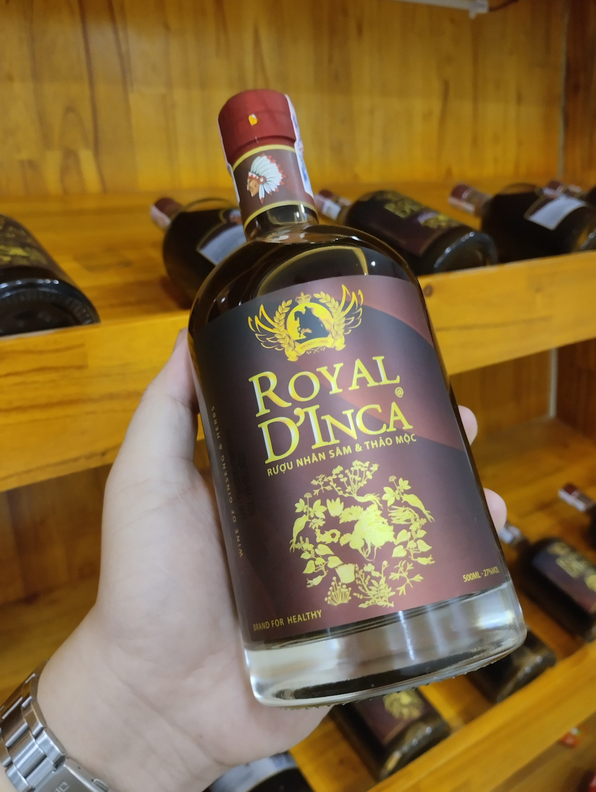 Tên sản phẩm: Royal D’Inca - Rượu sâm Maca & thảo mộc Dung tích: 500ml Nồng độ: 27% Vol Xuất xứ: Việt Nam Thành phần: Rượu gạo nếp, sâm Maca Peru, Đông Trùng Hạ Thảo,