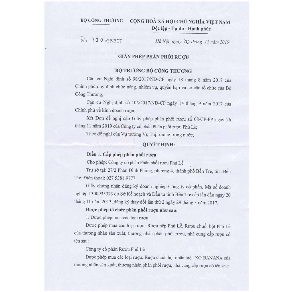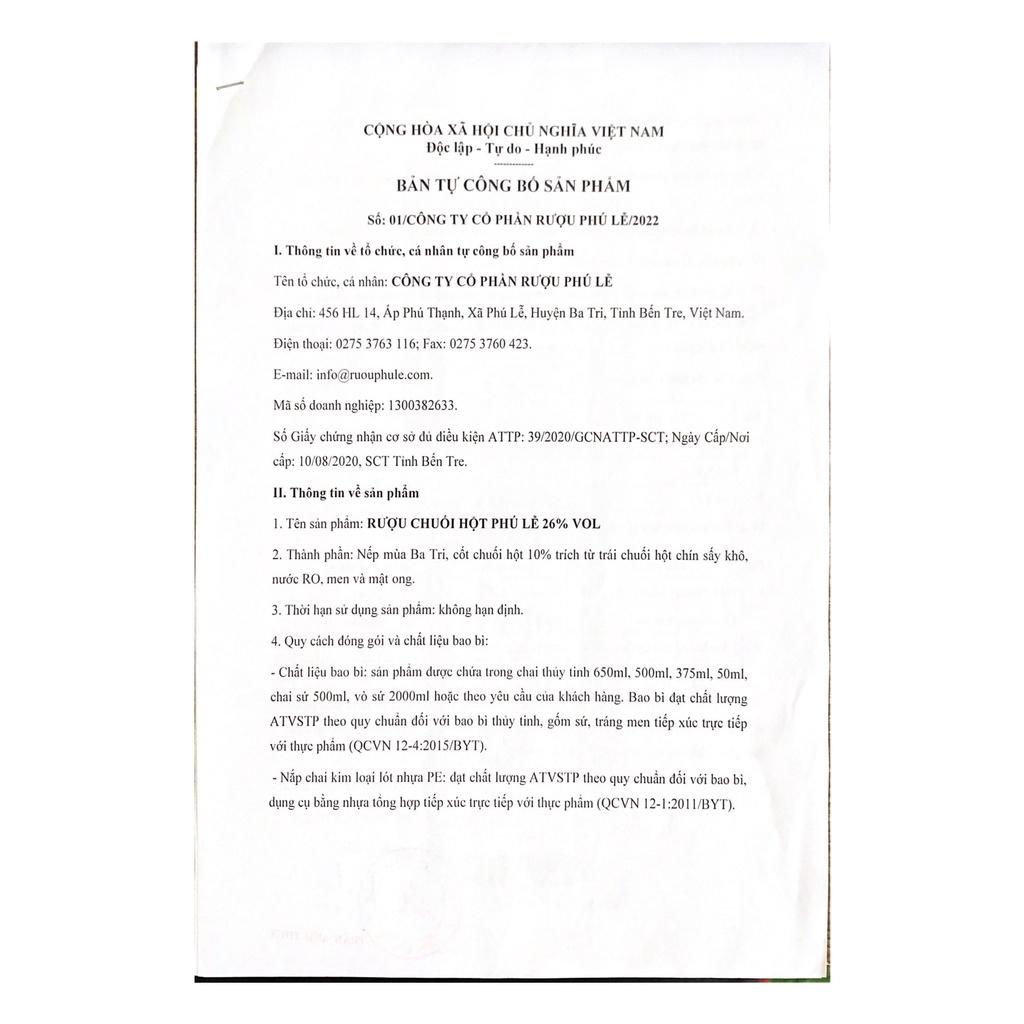 RƯỢU PHÚ LỄ - KHƠI BẢN SẮC, TOẢ TINH HOA RƯỢU VIỆT Công ty Cổ phần Rượu Phú Lễ là công ty sản xuất rượu Việt Nam có trụ sở chính tại số 456 HL 14, xã Phú Lễ, huyện Ba Tri, tỉnh Bến Tre. Sản phẩm của công ty được người tiêu dùng tin chọn là Hàng Việt Nam chất lượng cao trong nhiều năm liên tục (kể từ năm 2011 cho đến nay) RƯỢU CHUỐI HỘT PHÚ LỄ - ĐẬM ĐÀ HƯƠNG VỊ ĐẶC TRƯNG Với thành phần chính là Nếp mùa Ba Tri, loại nếp dài ngày thơm ngon bậc nhất miền châu thổ phù sa, cùng bài hồ men truyền thống Phú Lễ được làm từ 36 vị thảo mộc thiên nhiên quyện cùng vị chát dịu của Chuối Hột chín được chọn lựa kỹ càng, tạo nên dòng rượu vàng trong thơm mùi cỏ cây, từ lâu đã trở thành thức uống dân gian gắn liền với đời sống văn hóa của người dân Nam Bộ. Rượu Chuối Hột Phú Lễ có hậu vị ngọt, chát nhẹ; cho cảm giác the cay, ấm nồng; không gây đau đầu, khô cổ, mang lại cảm giác dịu êm sảng khoái. MÔ TẢ SẢN PHẨM Dung tích: 650ml Nồng độ cồn: 26% Vol Thành phần: nếp mùa Ba Tri, cốt chuối hột 10% trích từ trái chuối hột chin sấy khô, nước tinh khiết, men và mật ong Xuất xứ: Ba Tri, Bến Tre, Việt Nam Hướng dẫn sử dụng: thích hợp cho bàn tiệc từ 5-7 người HẠN SỬ DỤNG Không hạn định THƯỞNG THỨC CÓ TRÁCH NHIỆM Không chia sẻ nội dung này cho người dưới 18 tuổi