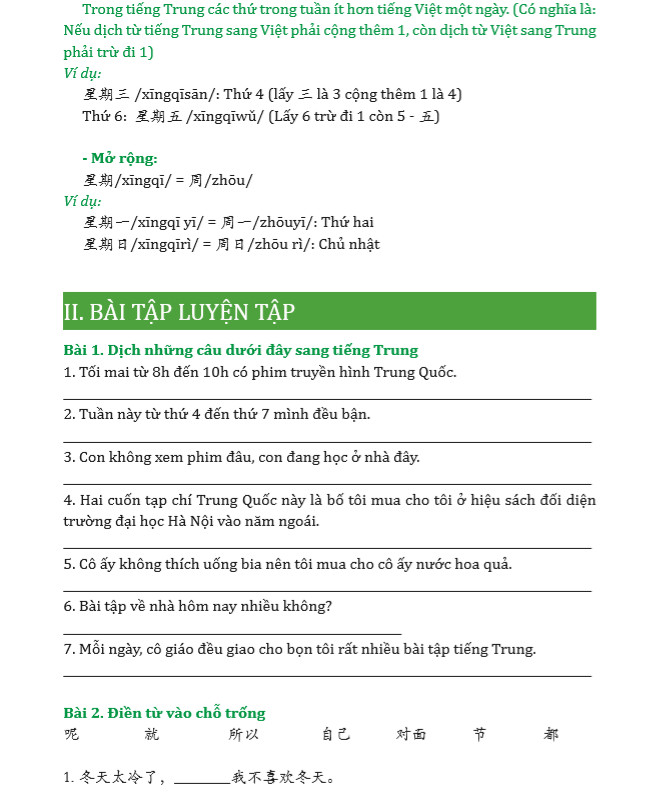 - Vd về cách ghép các bộ trong tiếng Trung 想Chữ “xiăng” gồm có 3 bộ ghép lại : bộ Mộc, bộ Mục và bộ Tâm (bộ Mộc ở bên trái viết trước, sau đó tới bộ Mục ở bên phải, cuối cùng là bộ Tâm ở dưới.) 船 Chữ “chuán” gồm có 3 bộ ghép lại : bộ Chu, bộ Nhi và bộ Khẩu (bộ Chu ở bên trái viết trước, bộ Nhi ở bên phải nằm trên viết sau, cuối cùng là bộ khẩu ở dưới) Viết và học từ mới mỗi ngày: Tiếng Trung không giống như tiếng Việt. Bởi có hệ thống chữ cái là chữ tượng hình, vì vậy một quyển vở ô ly có thể giúp chúng ta căn được các nét và tập viết sao cho chuẩn. Hãy chọn bút ngòi mềm (bút chì, bút nước, bút mực không có ngòi thanh đậm). Chúng sẽ giúp nét bút mềm mại và thanh thoát hơn. Muốn chữ viết được đẹp và có tiến bộ, đầu tiên hãy dùng bút chì và bút nước để luyện trước nhé! Đã có vở và bút, tiếp theo là thể hiện sự quyết tâm chinh phục tiếng Trung đi nào. Bằng sự chăm chỉ học từ mới mỗi ngày, bạn sẽ thấy mình tiến bộ vượt bậc. Hãy học cách luyện tập ngữ pháp. Bằng cách viết thật nhiều ví dụ và sử dụng cấu trúc ngữ pháp + từ mới thì sẽ không bị mau quên! Bạn có thể tự đặt ra chỉ tiêu viết mỗi từ mới lần đầu là 5 dòng. Tiếp theo những ngày sau học lại chỉ cần viết lại 1 dòng.