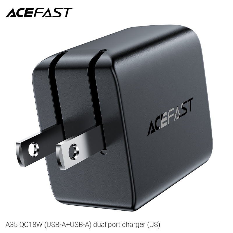 Sạc ACEFAST A35, 2 cổng USB-A QC18W, phích cắm US, hỗ trợ hầu hết các giao thức sạc nhanh. Thông số kỹ thuật: - Chất liệu: PC chống cháy. - Input: AC 100-240V, 0.6A, 50/60Hz, phích cắm US. - Output: Mỗi cổng ra: -