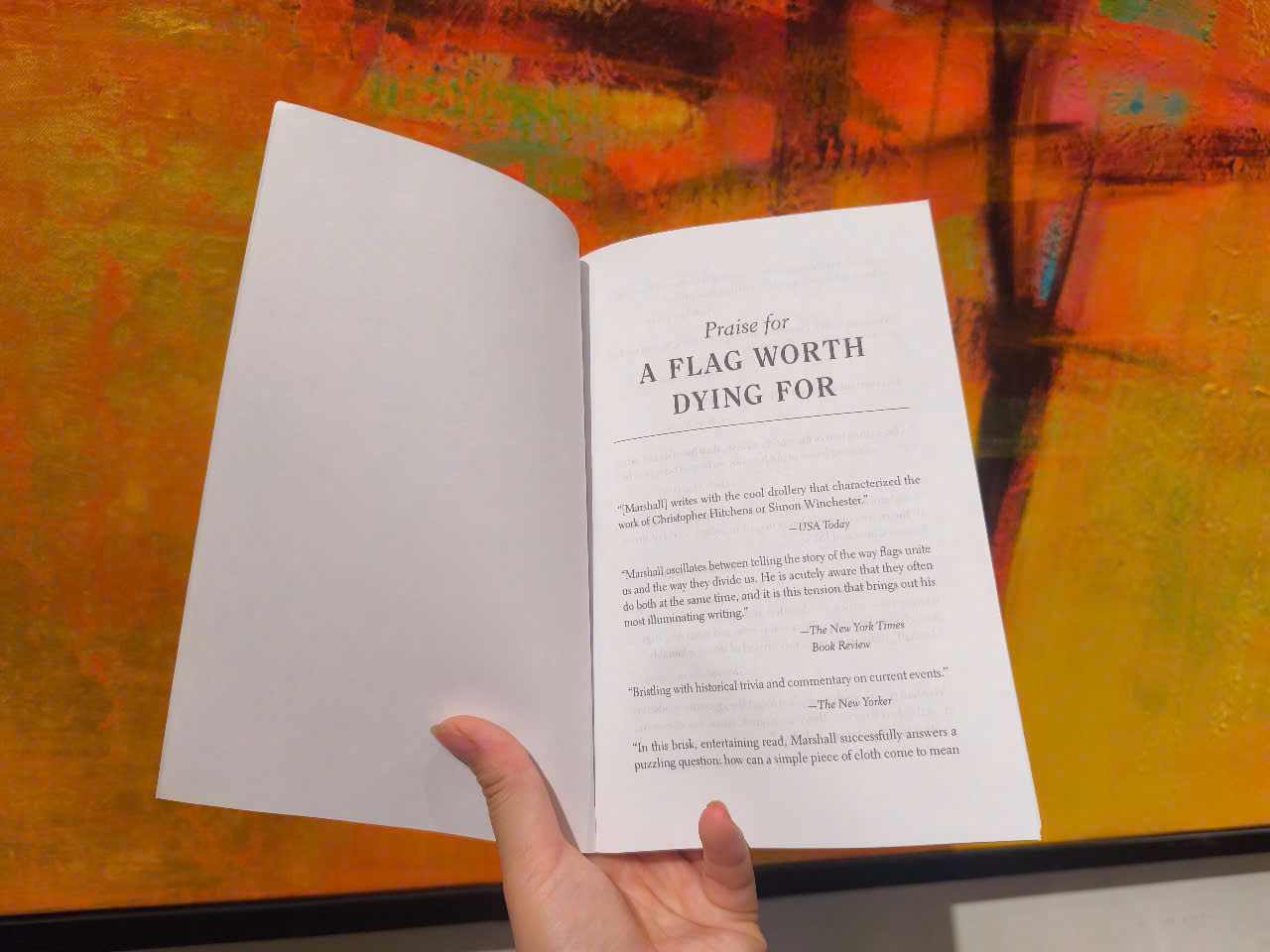 Trong chín chương (bao gồm Hoa Kỳ, Vương quốc Anh, Châu Âu, Trung Đông, Châu Á, Châu Phi, Châu Mỹ Latinh, cờ quốc tế và cờ khủng bố), A Flag Worth Dying For của Tim Marshall là một "cuốn sách thú vị, hấp dẫn... trả lời thành công một câu hỏi khó hiểu: làm thế nào một mảnh vải đơn giản lại có thể có ý nghĩa lớn đến vậy? Marshall trình bày một cuộc khảo sát thông tin về những biểu tượng dễ thấy này của niềm tự hào quốc gia hoặc quốc tế" (Publishers Weekly), đại diện cho các quốc gia dân tộc và các tác nhân phi nhà nước (bao gồm , Hezbollah và Hamas), và giải thích cách chúng xuất hiện trong các mối quan hệ ngoại giao và các sự kiện ngày nay.