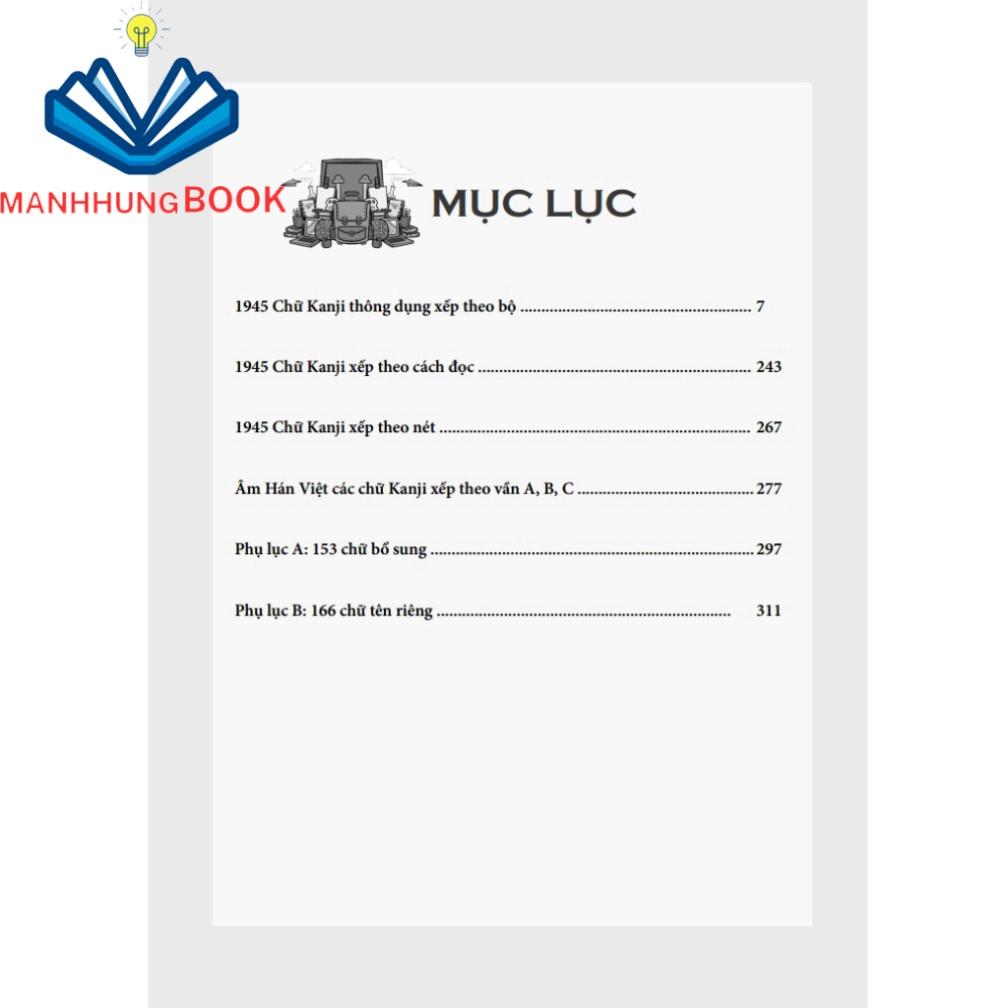 --------------------------giới thiệu sách------------------------- Tiếng Nhật hiện nay đang là một trong những ngôn ngữ được học nhiều nhất tại Việt Nam. Có lẽ với những ai đã và đang học tiếng Nhật thì đều hiểu rằng chữ Kanji là một phần không thể thiếu với người học tiếng Nhật. Không có chữ Kanji bạn không thể đọc sách báo tiếng Nhật để nâng cao khả năng ngôn ngữ của mình. Vì vậy, việc ôn tập và trau dồi vốn chữ Kanji là việc làm cần thiết xuyên suốt quá trình học của người học tiếng Nhật. Hiểu được điều đó ban biên tập The Hikari đã dày công biên soạn cuốn “Bảng chữ Kanji thông dụng trong tiếng Nhật” giúp người học dễ dàng tra cứu hơn. -Cuốn sách bao gồm 1945 chữ Kanji được sử dụng trong toàn bộ đời sống cũng như trong các văn bản của người Nhật. Có các phần tra cứu theo số nét, tra cứu theo âm Kanji Việt, cách đọc onyomi hoặc kunyomi … Ở mỗi chữ Kanji không chỉ có thông tin về ý nghĩa, âm Kanji Việt, thứ tự nét viết, cách đọc mà chúng tôi còn bổ sung thêm cả các từ vựng cũng như những câu văn ví dụ liên quan đến chữ Kanji đó để bạn đọc có được hình dung chính xác và đầy đủ nhất về chữ Kanji đó. Mặc dù đã rất cố gắng song trong quá trình biên soạn khó có thể tránh khỏi những sai sót nhỏ.