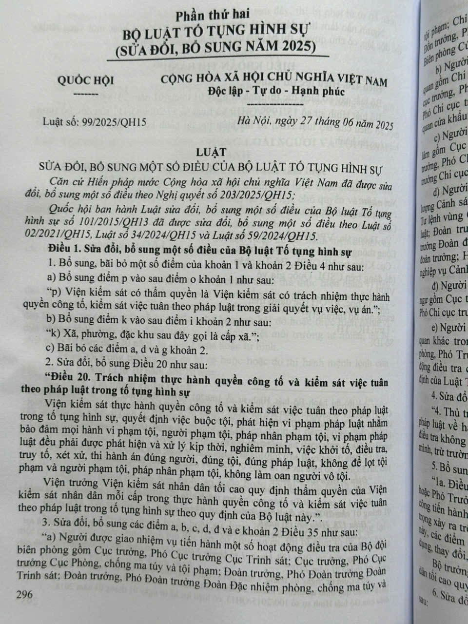 Tại Kỳ họp thứ 9 Quốc hội nước Cộng hòa xã hội chủ nghĩa Việt Nam khóa XV đã thông qua Luật số 86/2025/QH15 ngày 25 tháng 6 năm 2025 của Quốc hội ban hành Luật sửa đổi, bổ sung một số điều của Bộ luật Hình sự số 100/2015/QH13 đã được sửa đổi, bổ sung một số điều theo Luật số 12/2017/QH14 và Luật số 59/2024/QH15, Luật số 99/2025/QH15 ngày 27 tháng 06 năm 2025 của Quốc hội ban hành Luật sửa đổi, bổ sung một số điều của Bộ luật TTHS số 101/2015/QH13 đã được sửa đổi, bổ sung một số điều theo Luật số 02/2021/QH15, Luật số 34/2024/QH15 và Luật số 59/2024/QH15.