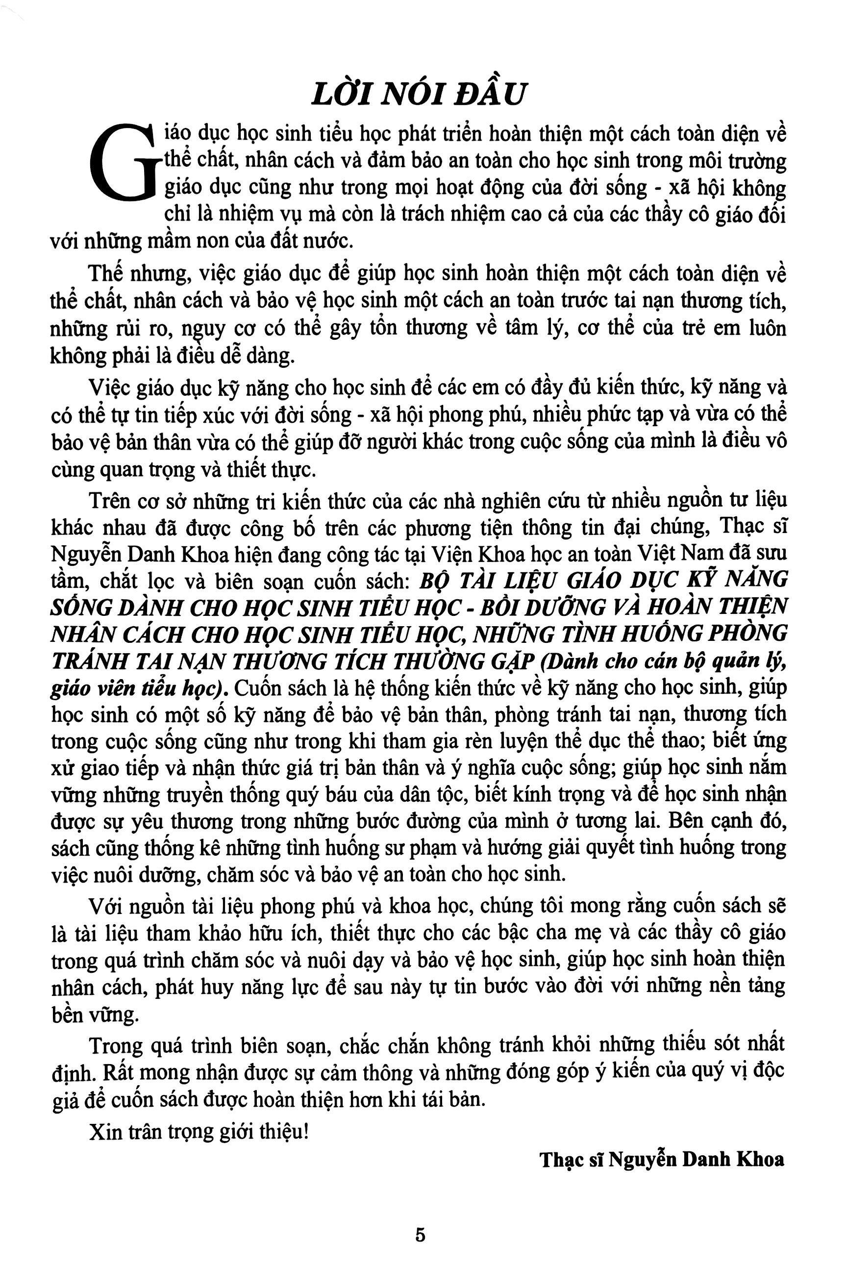 Trên cơ sở những tri kiến thức của các nhà nghiên cứu từ nhiều nguồn tư liệu khác nhau đã được công bố trên các phương tiện thông tin đại chúng, Thạc sĩ Nguyễn Danh Khoa hiện đang công tác tại Viện Khoa học an toàn Việt Nam đã sưu tầm, chắt lọc và biên soạn cuốn sách:Bộ Tài Liệu Giáo Dục Kỹ Năng Sống Dành Cho Học Sinh Tiểu Học - Bồi Dưỡng Và Hoàn Thiện Nhân Cách Cho Học Sinh Tiểu Học, Những Tình Huống Phòng Tránh Tai Nạn Thương Tích Thường Gặp(Dành cho cán bộ quản lý, giáo viên tiểu học)