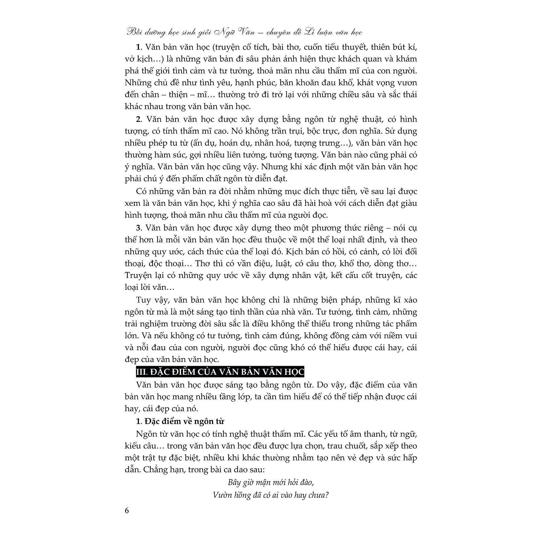 Đây là cuốn sách được nhóm biên soạn tập hợp những vấn đề cơ bản về lí luận văn học. Cuốn sách này được viết bởi nhiều giọng điệu, nhiều mức độ khai thác giá trị của văn chương để đáp ứng trình độ của đối tượng học sinh giỏi THCS & THPT. Sau mỗi bài học là câu hỏi và bài tập để học sinh tham khảo và vận dụng. Với nội dung khá phong phú, đa dạng như vậy thì đây là cách “Học khôn ngoan mà không gian nan”. Người biên soạn hi vọng đây sẽ là cuốn sách bổ ích đối với giáo viên và các em học sinh. Bể học là mênh mông vô tận, conngười chỉ là một giọt nước trong đại dương kiến thức. Người biên soạn khát khao, mong mỏi các em vượt khó để vươn lên học giỏi bộ môn Ngữ văn.