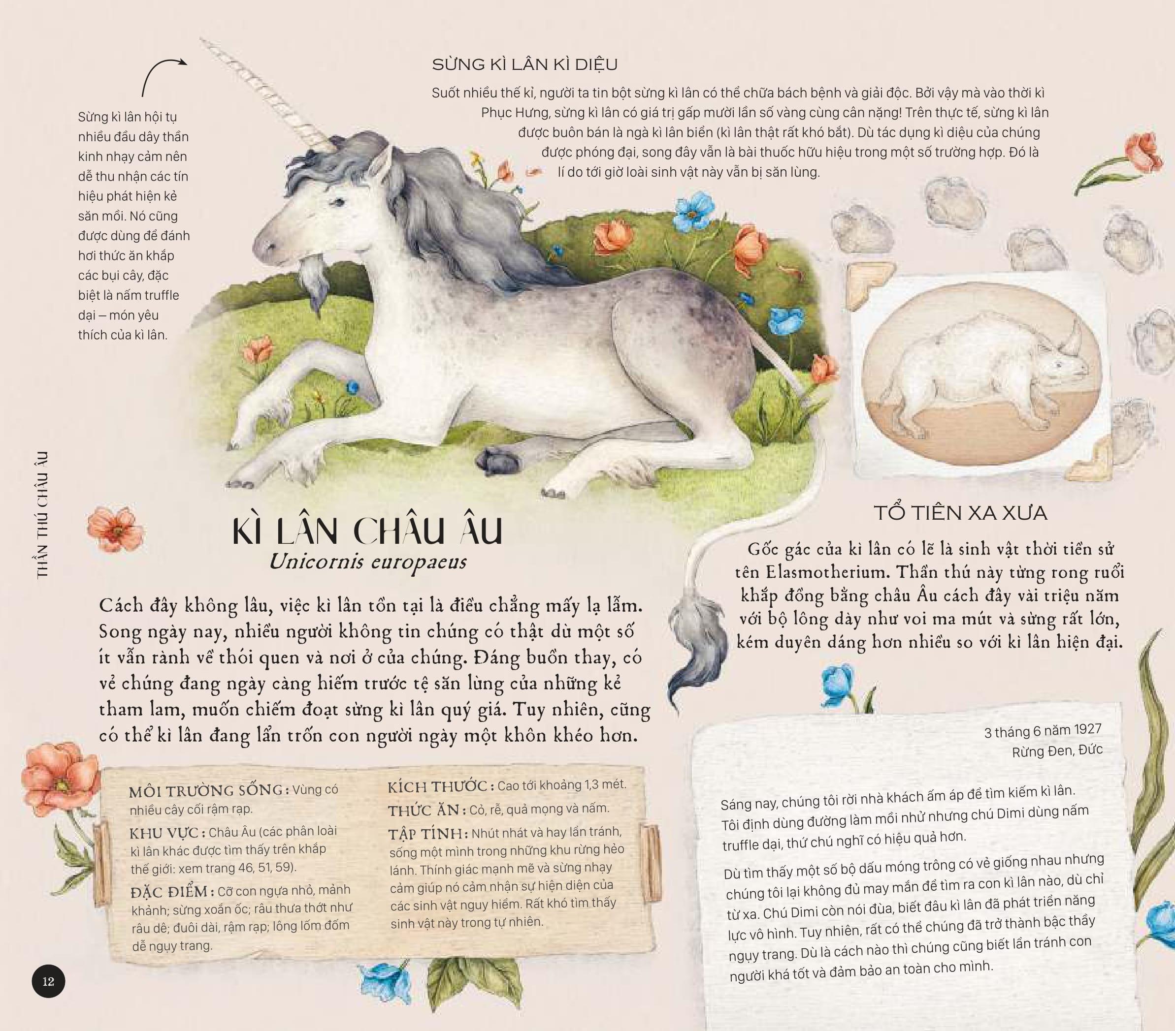 Mua tại TiktokCẩm Nang Về Sinh Vật Huyền Bí Bạn đọc thân mến, Bạn đã sẵn sàng cho chuyến hành trình có một không hai chưa? Vậy hãy lật giở cuốn sách này ngay thôi nào! Truyền kì về các loài sinh vật huyền bí đã được kể xuyên suốt nhiều thế hệ, ở khắp mọi nơi trên thế giới. Liệu những câu chuyện này chỉ là sản phẩm của trí tưởng tượng, hay bao điều chúng ta nghe về các loài rồng, nhân mã và điểu sư đều là sự thật? Biên soạn từ sổ tay của một nhà động vật học những năm 1920, cuốn sách sẽ trả lời câu hỏi trên thông qua việc hé lộ thế giới bí ẩn của muôn loài sinh vật huyền bí đã và đang sống giữa chúng ta. Lật giở từng trang sách, bạn sẽ không khỏi ngỡ ngàng, choáng ngợp trước những sinh vật tuyệt đẹp khắp đ.ịa cầu, khám phá đặc điểm, tập tính và huyền thoại lôi cuốn, kịch tính xung quanh chúng. Cảm giác còn trên cả phấn khích khi được hiểu thêm về chiếc sừng phép thuật của kì lân, vòng đời của phượng hoàng, vũ điệu ghép đôi của mãng xà và nhiều những chỉ dẫn siêu thiết thực về cách tiếp cận, tìm kiếm các sinh vật này. Nếu bạn tin vào thế giới huyền ảo và khao khát tự m.ình tìm gặp một trong các sinh vật huyền bí, cuốn sách này sẽ là điểm khởi đầu hoàn hảo dành cho bạn.