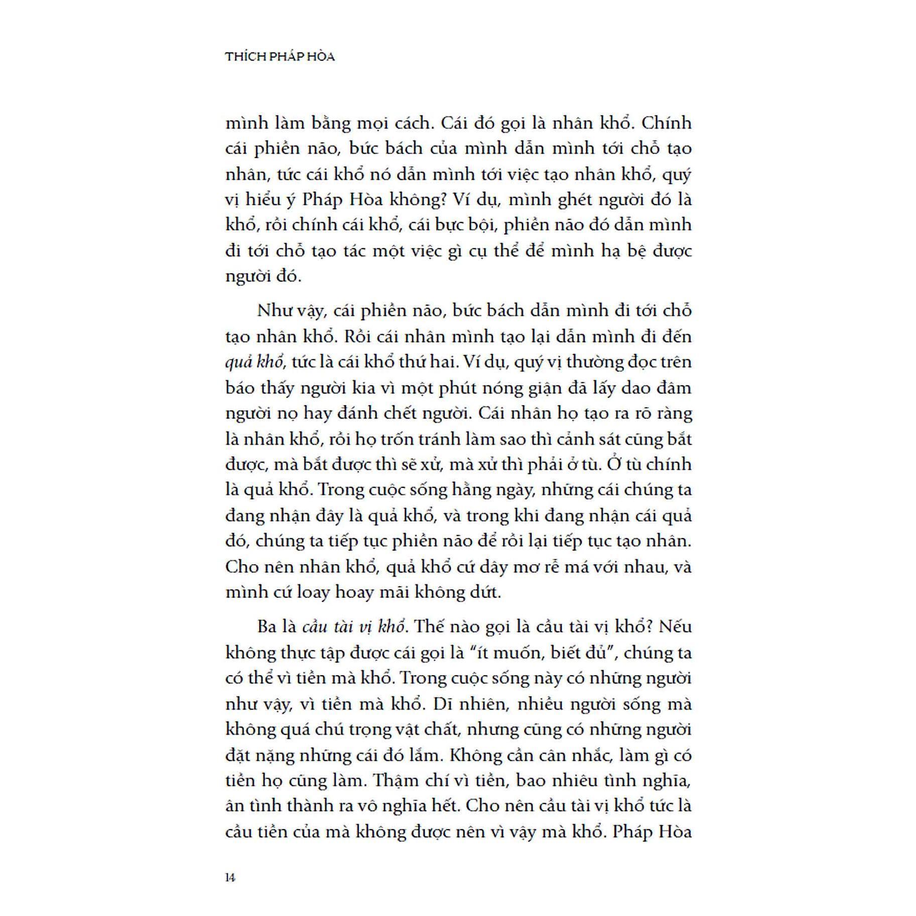 - Về tác giả: Thầy Thích Pháp Hòa sinh năm 1974 tại Cần Thơ, trong một gia đình có hai con trai và thầy là con trưởng. Cơ duyên của thầy với đạo Phật đã sớm bộc lộ từ khi thầy còn rất nhỏ. Vào năm bảy tuổi, thầy đòi mẹ dẫn vào một tịnh xá xin quy y và phát nguyện ăn chay, tụng kinh, thờ Phật. Tâm niệm xuất gia trong thầy cứ thế mỗi ngày một lớn. Năm mười hai tuổi, thầy và em trai cùng với mẹ sang Canada để đoàn tụ với cha của thầy. Khi đặt chân đến thành phố Edmonton (Canada), dù đối mặt với nhiều trở ngại, tâm bồ đề của thầy chẳng những không thối chuyển mà càng được củng cố mạnh mẽ hơn. Năm mười lăm tuổi, thầy chính thức xuất gia. Khi đó, tu viện Trúc Lâm tại Edmonton còn rất sơ khai. Năm 1994, khi vừa tròn hai mươi tuổi, thầy được vị bổn sư gửi sang Làng Mai (Pháp) để thọ giới tỳ-kheo và đã được thiền sư Thích Nhất Hạnh trực tiếp truyền giới trong đại giới đàn Hương Tích. Tuy thời gian lưu lại tại Làng Mai ngắn ngủi (chỉ trong vòng một tháng) nhưng thầy đã tiếp nhận và học hỏi được rất nhiều. Từ đó, thầy có thể dung hòa những hình thức tu tập mới vào truyền thống mà thầy đang theo để ngày càng tăng tiến trong đạo. Sau khi nhận truyền đăng từ thiền sư Thích Nhất Hạnh vào năm 1999, thầy lại trở về Canada tiếp tục con đường hoằng pháp của mình. Đến năm 20, sau một thời gian tu tập và giảng pháp, thầy được vị bổn sư tin cậy giao phó vai trò trụ trì Tu viện Trúc Lâm (tỉnh Alberta, Canada). Năm 20, sau khi tu viện Tây Thiên được hoàn thành, thầy đảm nhiệm thêm trọng trách trụ trì tu viện Tây Thiên. Với phong cách giản dị, gần gũi, khiêm cung và khả năng chuyển tải Phật pháp thâm sâu thành những cách thực hành gần gũi trong đời sống, thầy Thích Pháp Hòa nhận được sự yêu mến của đông đảo đại chúng thông qua những bài giảng pháp trên YouTube. Thầy là một minh chứng cho thấy rằng những vị chân tu vẫn có thể chinh phục lòng người theo cách “hữu xạ tự nhiên hương”. Thông tin sách: