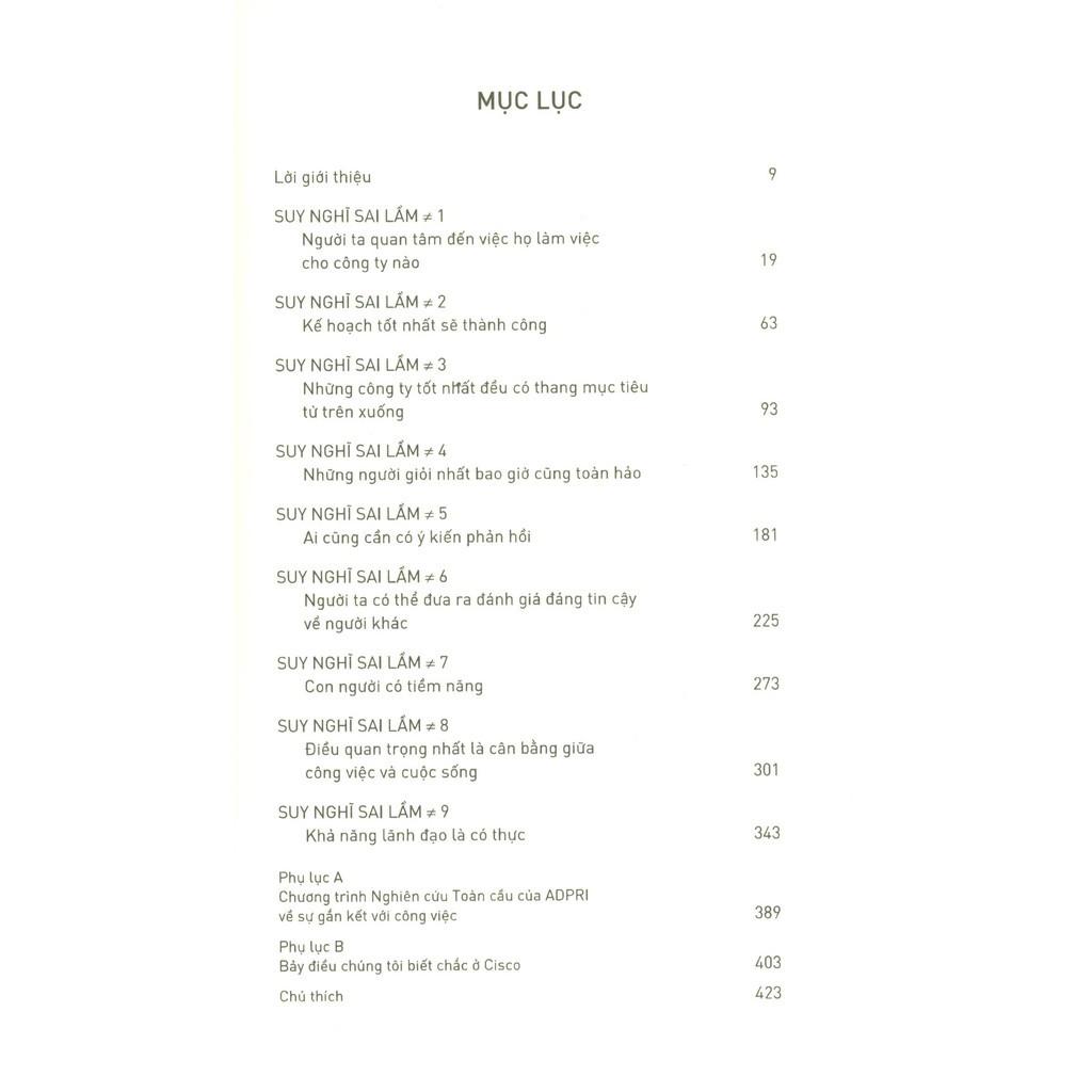 Những điều trên nghe ra có vẻ như là những chân lý nền tảng cho đời sống công việc của chúng ta ngày hôm nay. Nhưng thực ra, chúng là những điều không thật. Trong cuốn sách Chín suy nghĩ sai lầm về công việc gây tranh cãi và truyền cảm hứng này, chúng ta sẽ gặp những điều không thật này – những lệch lạc, những giả định đầy khuyết điểm, và suy nghĩ sai lầm – mỗi khi chúng ta tới nơi làm việc. Chúng dẫn đến rối loạn và thất vọng, và cuối cùng khiến công sở của chúng ta trở thành một cái bóng mờ nhạt của những gì lẽ-ra-có-thể-tốt-hơn.