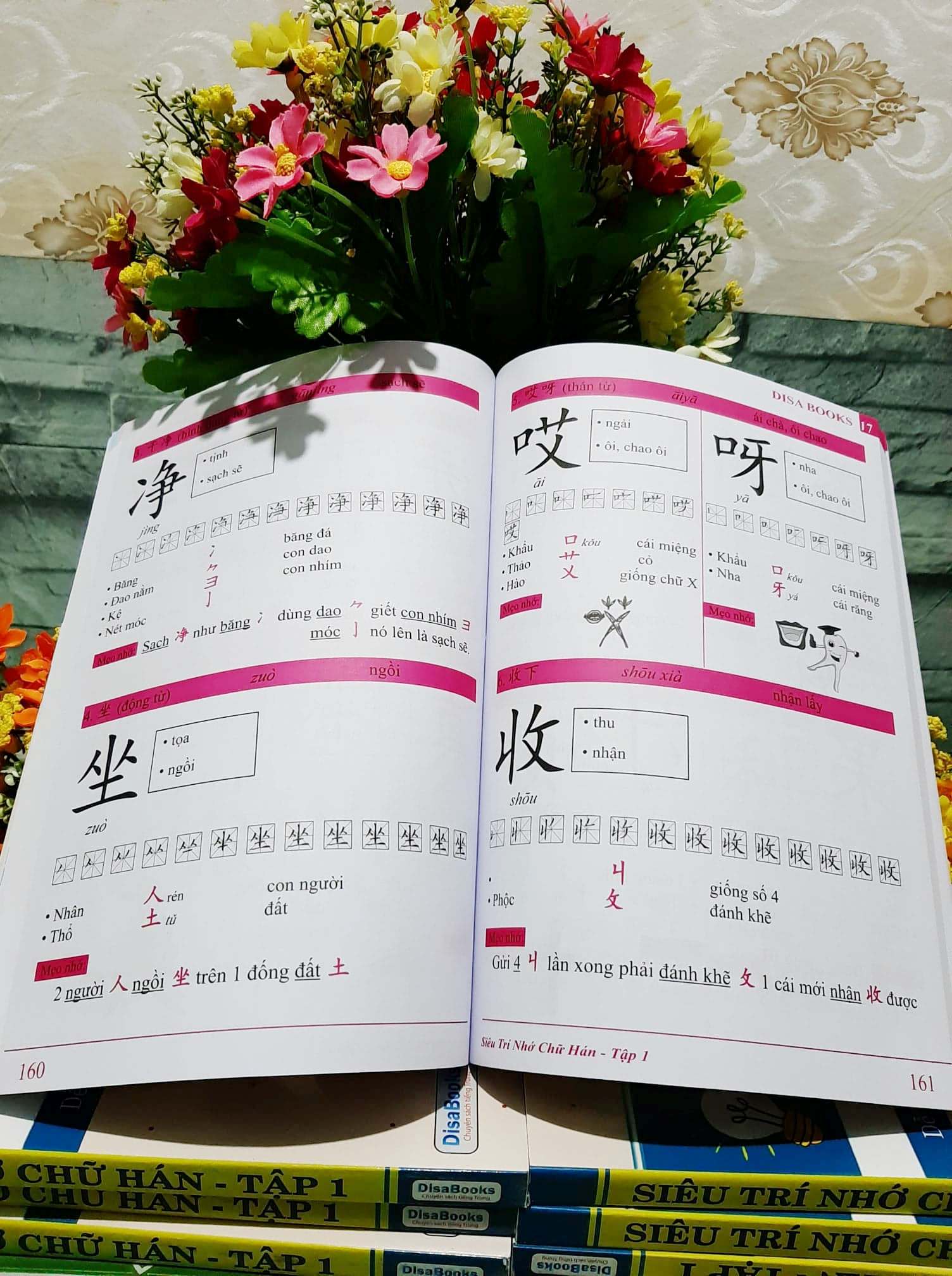 1. Siêu trí nhớ chữ Hán tập 02 Nội dung sách: Giúp bạn dễ dàng nhớ ngay 1000 chữ Hán chỉ sau 2 tháng thông qua mẹo nhớ và hình ảnh dễ hiểu. Tác giả: Diệu Hồ – Phạm Thành Luân Số trang: 268 Năm xuất bản: 2019 Nhà Xuất Bản: Đà Nẵng Cách nhớ chữ Trung Quốc (chữ Hán) a. Nhớ chữ Hán bằng các bộ thủ Bộ thủ chính là cách nhớ chữ Hán hiệu quả , mỗi bộ thủ trong tiếng Hán lại biểu hiện một hiện tượng sự vật riêng. Nhớ được các bộ thủ đó chính là đã nhớ cách viết tiếng Trung như thế nào. Và việc còn lại chính là ghép các bộ thủ đó với nhau để tạo nên được một chữ hoàn chỉnh. vd: chữ 安 Ở trên là bộ 宀 miên => mái nhà mái che, Ở dưới là bộ女 nữ => nữ giới, con gái, đàn bà. Người phụ nữ ở dưới trong nhà thì rất “an” toàn. Ví dụ: 安全 (Ānquán) – An Toàn. Mẹo nhỏ cho những người mới học viết tiếng Trung có thể nhớ đó là dùng các mảnh giấy nhớ, ghi lại những bộ thủ hay những từ mới bằng việc tập viết tiếng Trung. Để những mảnh giấy nhớ đó ở những nơi dễ thấy. Việc nhìn liên tục đó sẽ giúp bạn vừa có thể nhớ chữ vừa có thể nhớ từ. b. Cách nhớ chữ Hán qua thơ Các từ chữ Hán được học bằng cách gieo vần nhịp để người học nhớ chữ Hán dễ hơn như: “Chim chích mà đậu cành tre Thập trên tứ dưới đè chữ tâm” (Chữ Đức) Hay: “Tai nghe miệng nói đít làm vua”. (Chữ Thánh) Nhớ chữ Hán bằng cách vẽ lại những từ đấy. Nhớ các nét, mô phỏng lại và vẽ, đây là một trong những cách rất tốt để nhớ chữ Hán Chữ Hán có hai cách viết là giản thể và phồn thể. Đa phần các giáo trình tiếng Trung đều là chữ giản thể do đó rất nhiều trường hợp đã gặp lúng túng khi tiếp xúc với chữ phồn thể. Nếu để ý thì cách chữ phồn thể có cách viết chỉ khác chữ giản thể một chút. Trong quá trình học, đừng ngần ngại mà nhờ giáo viên chỉ hướng dẫn cách viết chữ phồn thể (viết tiếng trung) nếu công việc của bạn phải tiếp xúc với kiểu chữ này.