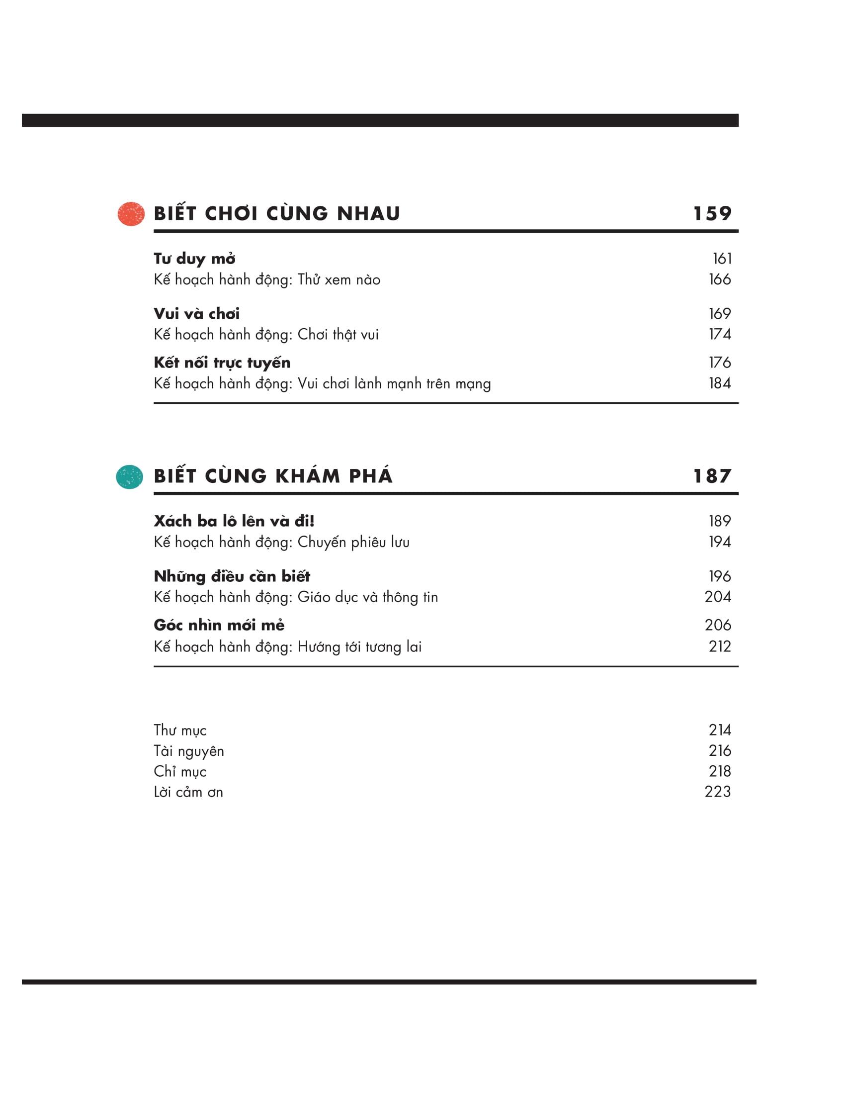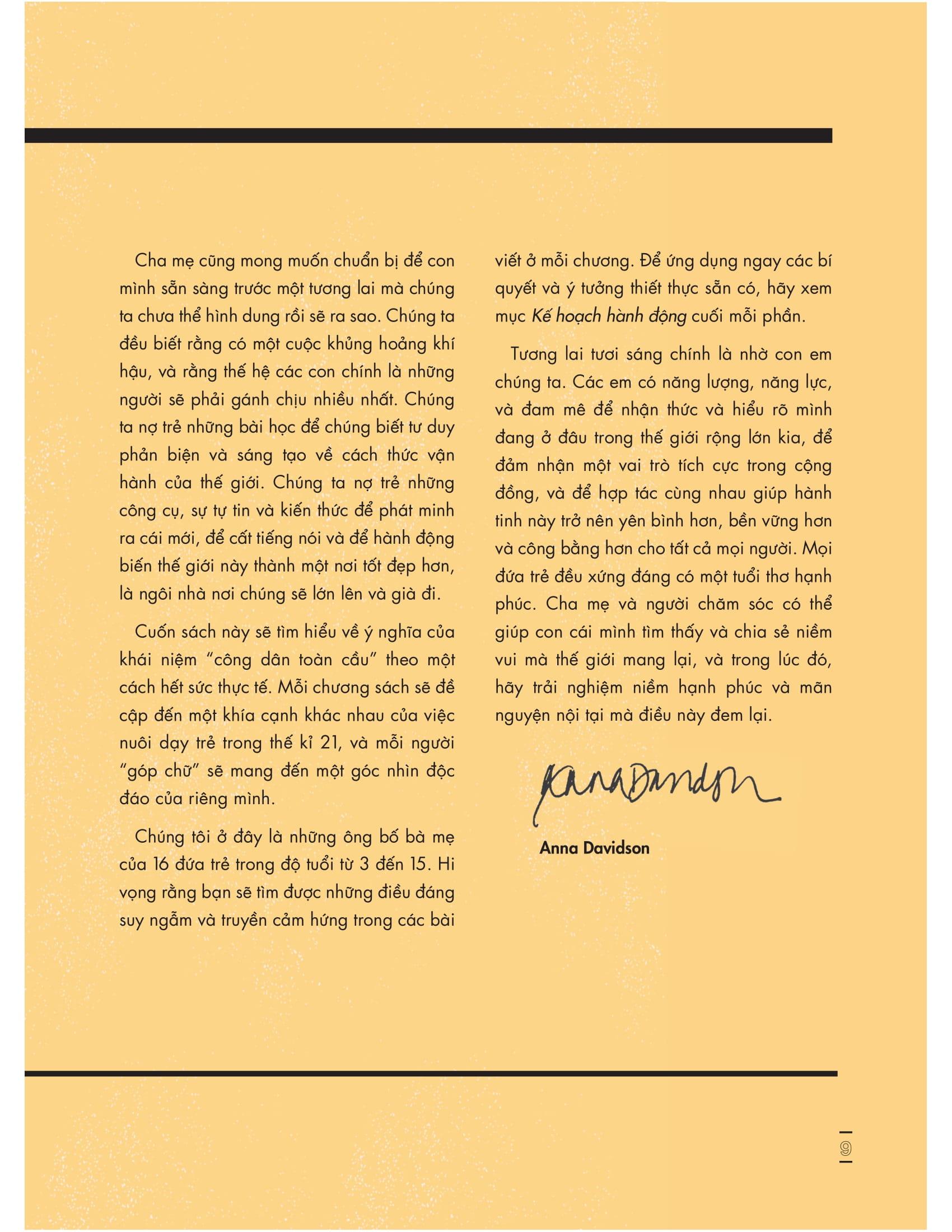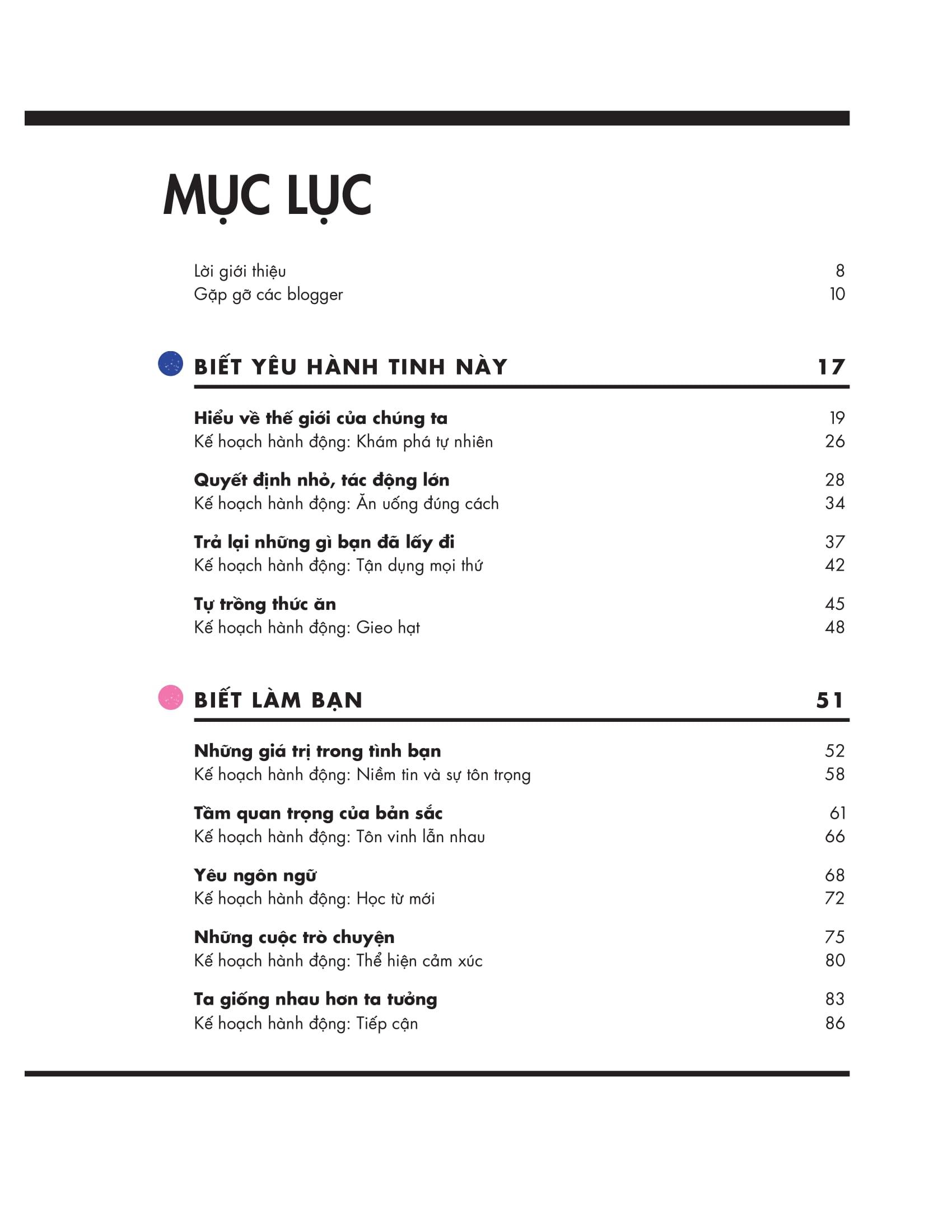 - Nội dung chính: Sách gồm 6 chương, mỗi chương đề cập đến một khía cạnh khác nhau của việc nuôi dạy trẻ trong thế kỉ 21; trong đó mỗi người góp chữ sẽ chia sẻ một góc nhìn độc đáo của riêng m.ình; cuối mỗi phần nhỏ là mục Kế hoạch hành động cung cấp các ý tưởng và hướng dẫn chi tiết để độc giả có thể thực hành cùng con: Chương 01 – Biết yêu hành tinh này Chương 02 – Biết làm bạn Chương 03 – Biết xây dựng cộng đồng Chương 04 – Biết bày tỏ ý kiến Chương 05 – Biết chơi cùng nhau Chương 06 – Biết cùng khám phá