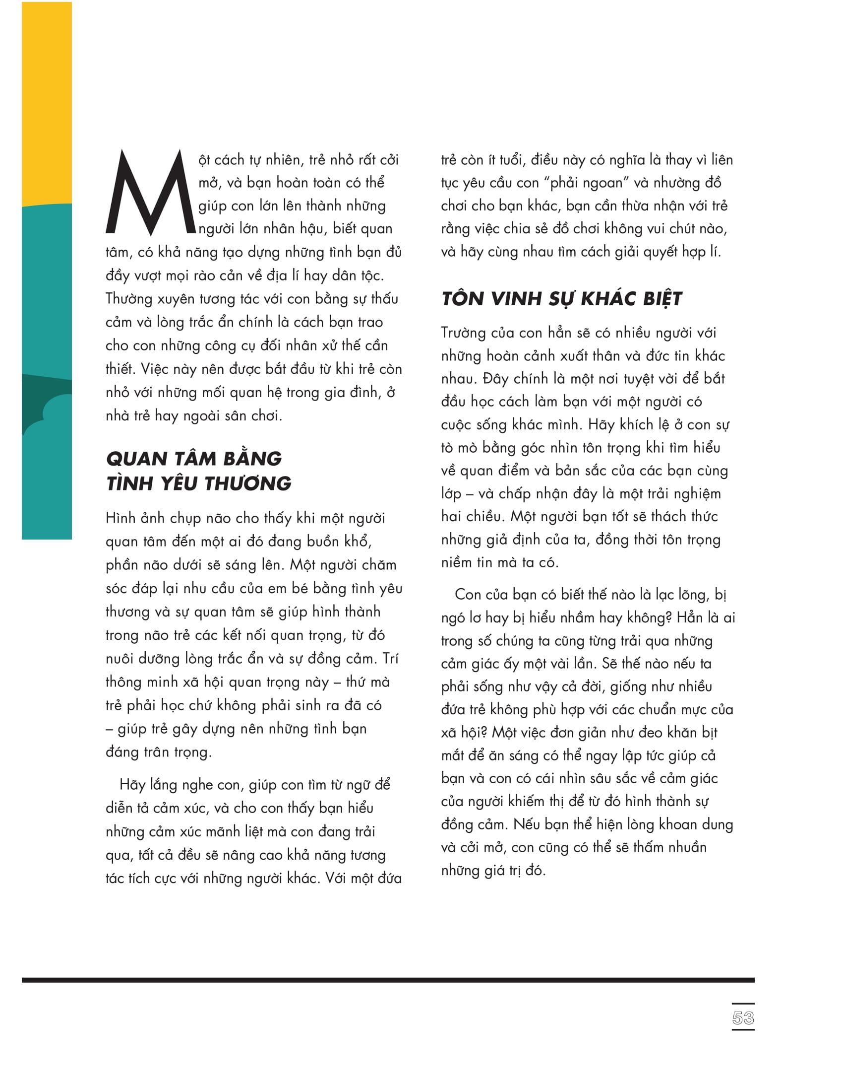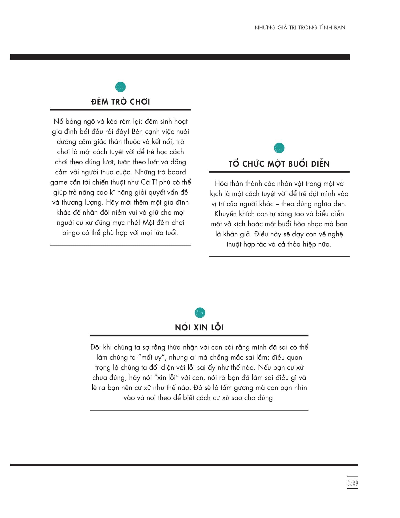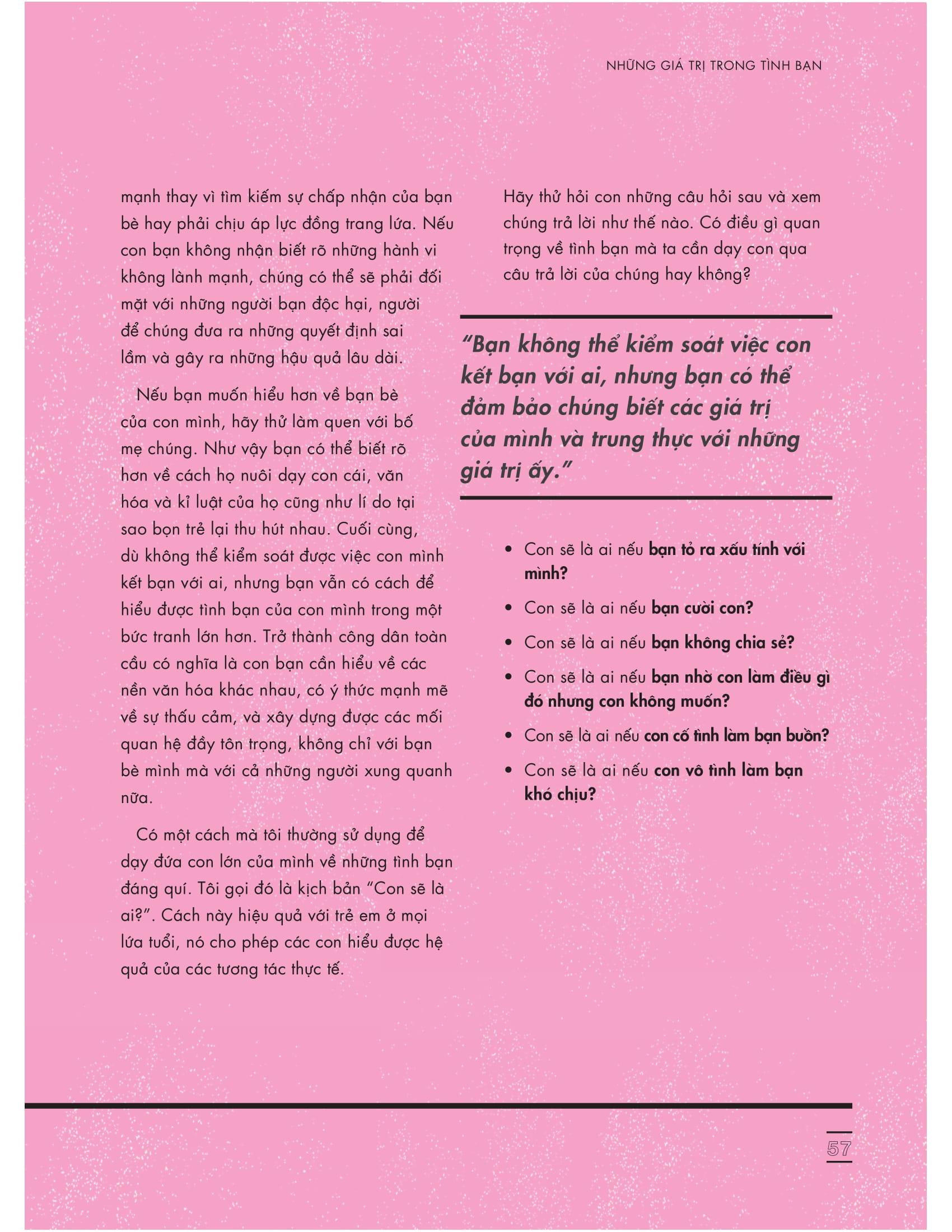 - Nội dung chính: Sách gồm 6 chương, mỗi chương đề cập đến một khía cạnh khác nhau của việc nuôi dạy trẻ trong thế kỉ 21; trong đó mỗi người góp chữ sẽ chia sẻ một góc nhìn độc đáo của riêng m.ình; cuối mỗi phần nhỏ là mục Kế hoạch hành động cung cấp các ý tưởng và hướng dẫn chi tiết để độc giả có thể thực hành cùng con: Chương 01 – Biết yêu hành tinh này Chương 02 – Biết làm bạn Chương 03 – Biết xây dựng cộng đồng Chương 04 – Biết bày tỏ ý kiến Chương 05 – Biết chơi cùng nhau Chương 06 – Biết cùng khám phá