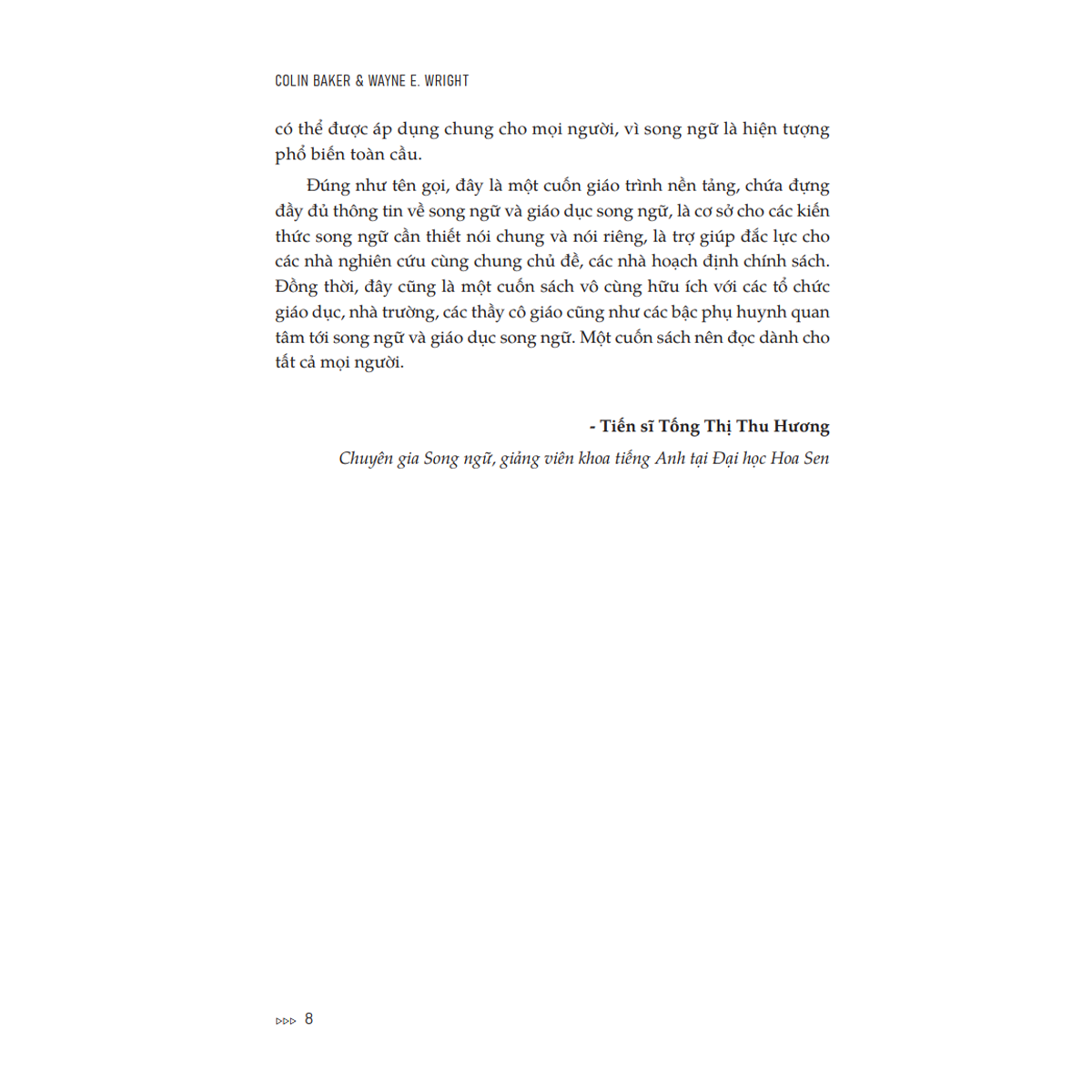 Wayne E. Wright là Giáo sư, Chủ nhiệm khoa Văn học và Ngôn ngữ tại Đại học Purdue, Hoa Kỳ. Ông đã công bố hơn 100 ấn phẩm nghiên cứu và là tác giả sách bán chạy nhất về lĩnh vực dạy học tiếng Anh. Ngoài việc tham gia biên tập của Tạp chí Ngôn ngữ, Bản sắc và Giáo dục (Journal of Language, Identity and Education), ông còn là đồng biên tập bộ sách Giáo dục song ngữ và các vấn đề Song ngữ của Multilingual Matters.