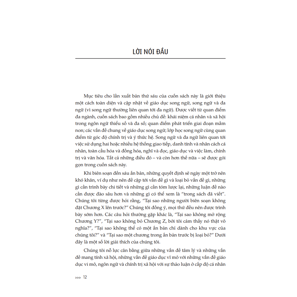Ấn bản thứ sáu (2017) đã được chỉnh sửa và cập nhật để giới thiệu toàn diện về song ngữ và giáo dục song ngữ trong thế kỷ XXI. Cuốn sách bàn về nhiều vấn đề về song ngữ ở cấp độ cá nhân, tập thể và xã hội.