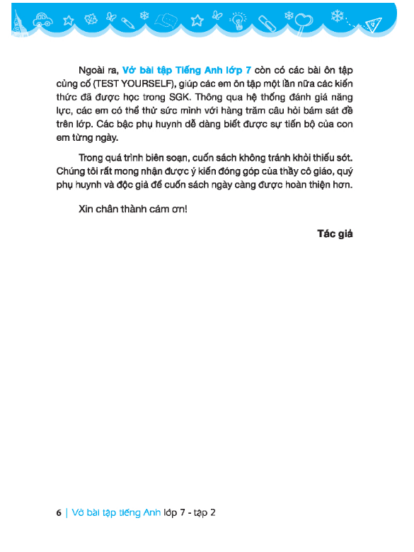 Vở bài tập Tiếng Anh lớp 7 được biên soạn với mục đích giúp giáo viên và học sinh có thêm tài liệu ôn tập và bổ trợ, nâng cao kiến thức môn Tiếng Anh. Cuốn sách được chia thành các đơn vị bài học bám sát Chương trình Giáo dục phổ thông mới của Bộ Giáo dục và Đào tạo. Thông qua hệ thống các bài học bám sát SGK hiện hành, với kiến thức bổ trợ nâng cao, cuốn sách hưởng tới phát triển toàn diện kỹ năng ngôn ngữ cho các em học sinh. Đây không chỉ là tài liệu bổ trợ giúp các em củng cố kiến thức cơ bản sau các bài học trên lớp mà còn là công cụ hỗ trợ các em không ngừng mở rộng và nâng cao kiến thức.