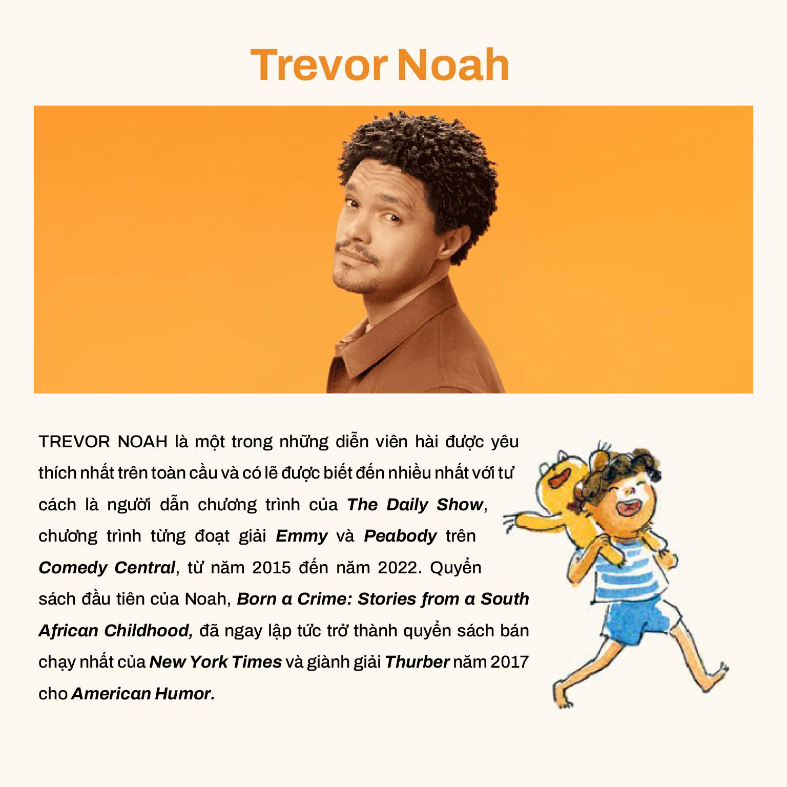 - TREVOR NOAH là một trong những diễn viên hài được yêu thích nhất trên toàn cầu và có lẽ được biết đến nhiều nhất với tư cách là người dẫn chương trình của The Daily Show, chương trình từng đoạt giải Emmy và Peabody trên Comedy Central, từ năm 2015 đến năm 2022. Quyển sách đầu tiên của Noah, Born a Crime: Stories from a South African Childhood, đã ngay lập tức trở thành quyển sách bán chạy nhất của New York Times và giành giải Thurber năm 2017 cho American Humor.