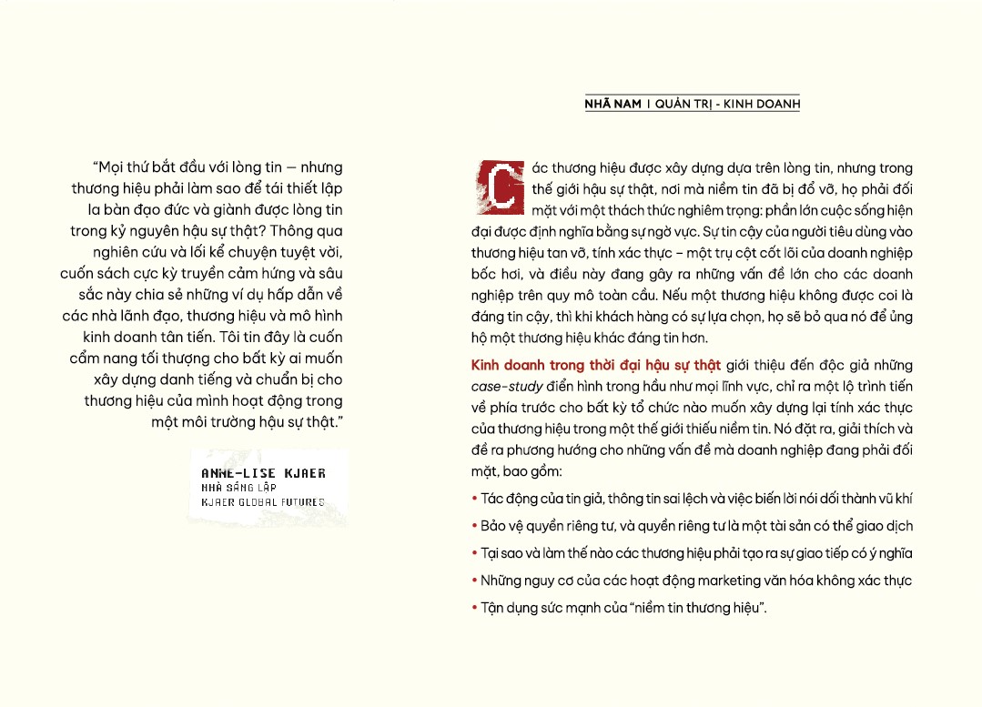 Các thương hiệu được xây dựng dựa trên lòng tin, nhưng trong thế giới hậu sự thật, nơi mà niềm tin đã bị đổ vỡ, họ phải đối mặt với một thách thức nghiêm trọng: phần lớn cuộc sống hiện đại được định nghĩa bằng sự ngờ vực. Sự tin cậy của người tiêu dùng vào thương hiệu tan vỡ, tính xác thực – một trụ cột cốt lõi của doanh nghiệp bốc hơi, và điều này đang gây ra những vấn đề lớn cho các doanh nghiệp trên quy mô toàn cầu. Nếu một thương hiệu không được coi là đáng tin cậy, thì khi khách hàng có sự lựa chọn, họ sẽ bỏ qua nó để ủng hộ một thương hiệu khác đáng tin hơn.