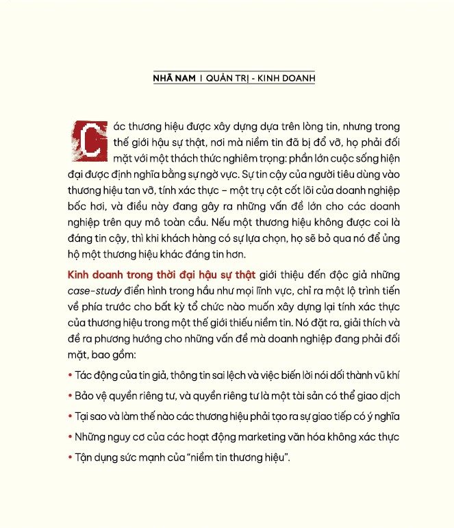 Kinh doanh trong thời đại hậu sự thật giới thiệu đến độc giả những case-study điển hình trong hầu như mọi lĩnh vực, chỉ ra một lộ trình tiến về phía trước cho bất kỳ tổ chức nào muốn xây dựng lại tính xác thực của thương hiệu trong một thế giới thiếu niềm tin. Nó đặt ra, giải thích và đề ra phương hướng cho những vấn đề mà doanh nghiệp đang phải đối mặt, bao gồm: