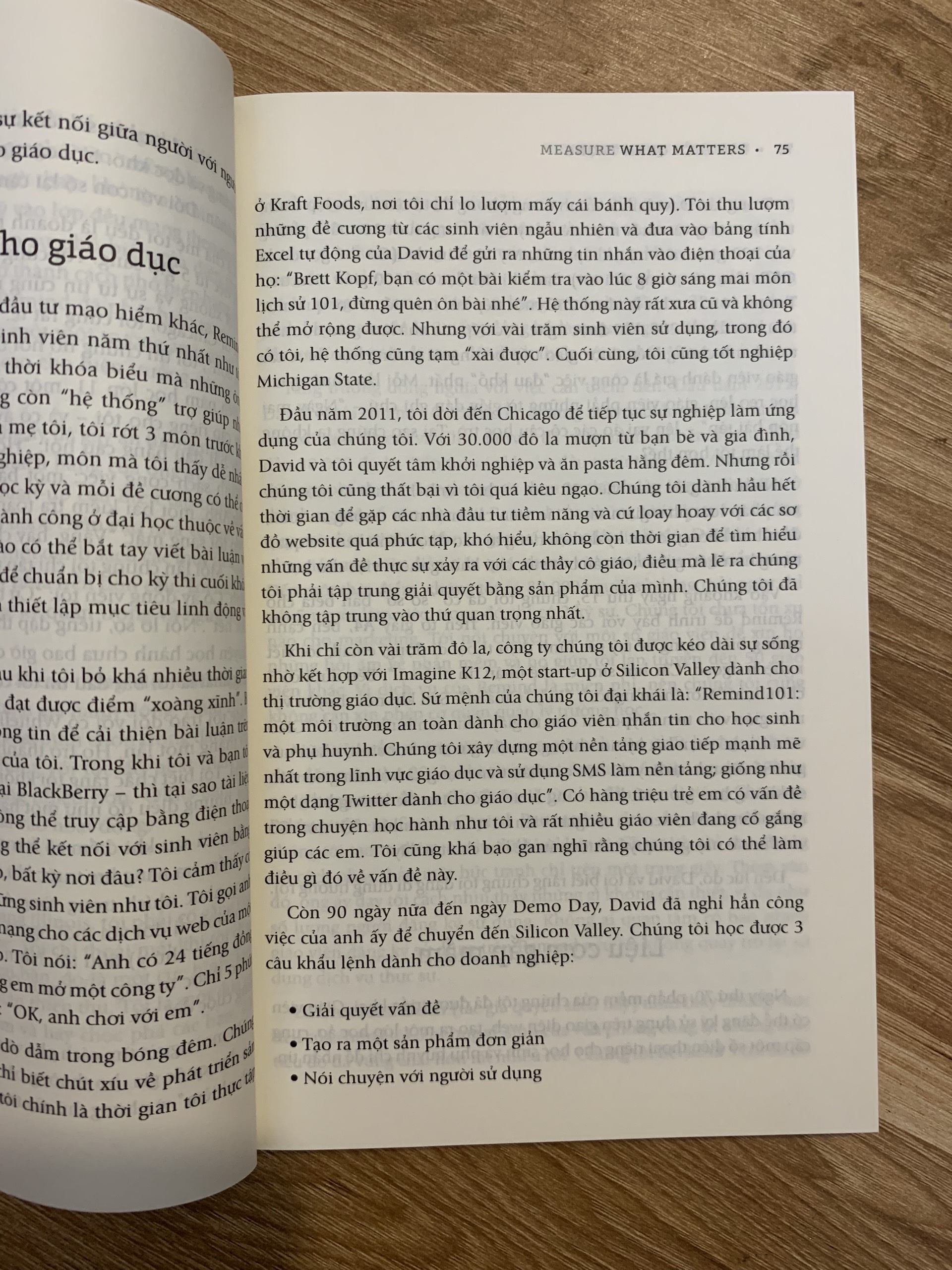 Quyển sách là tập hợp các câu chuyện có thật được chính những nhà sáng lập của Google, Nuna, MyFitnessPal, Remind, Gates Foundation, Ford, Wells Fargo,… kể lại. Có người thành công và cũng không thiếu người thất bại. Nhưng điểm chung là chúng đều để lại những bài học kinh nghiệm cho các nhà lãnh đạo khi muốn áp dụng OKRs.