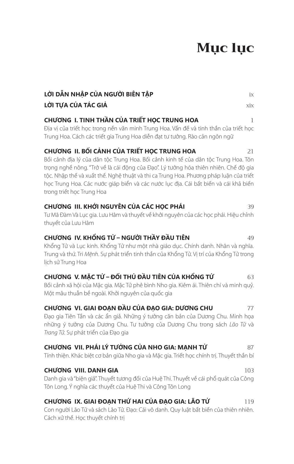 Cuốn sách làm sáng tỏ những trường phái triết học phổ biến nhất như Nho gia và Đạo gia; đồng thời giới thiệu với độc giả về Mặc gia, Âm Dương gia, Pháp gia, Tân Đạo gia, Tân Nho gia và sự du nhập của triết học Tây phương.