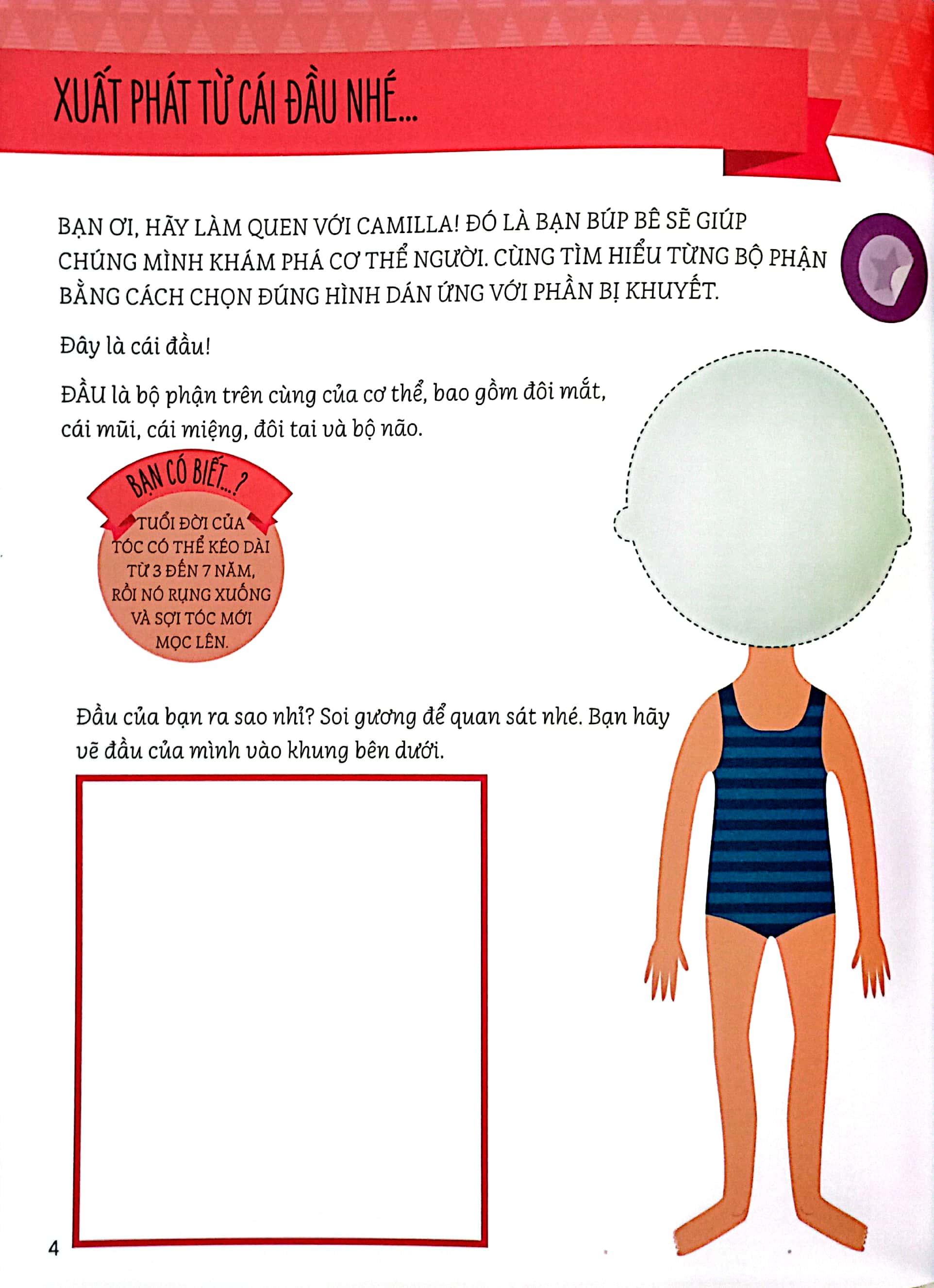 Mục đích của cuốn sách là giúp trẻ học biết vị trí của những cơ quan (nội tạng) cũng như các hệ trong cơ thể - tên gọi, kích cỡ và chức năng. Trẻ được gặp gỡ nhân vật “mẫu”, bạn búp bê Camilla; ở mỗi trang có một bộ phận của Camilla bị khuyết thiếu, trẻ cần tìm rồi đặt nó đúng vị trí. Tiếp đến, sách có cả hoạt động đồ họa, yêu cầu trẻ vẽ bộ phận được nhắc tới, nối các chấm (nét đứt), hoặc tô màu bộ phận đó, tạo ra hình dạng cho nó. Cuối cùng, chúng ta thấy những hoạt động dạy trẻ chức năng và hoạt động của từng bộ phận. Theo nguyên lý Montessori, trải nghiệm trực tiếp là một công cụ của tri thức, vì thế sách thiết kế một số bài tập thực hành đơn giản, cho trẻ dễ làm với chính cơ thể em. Ngay từ phần giới thiệu, trẻ đã có cơ hội thực hành dưới dạng trò chơi, như lấy hơi thổi, nghe nhịp tim, nâng vật thể, thử độ dẻo dai của cơ bắp v.v. sau đó chọn hình dán để ghi lại kết quả. Những hoạt động nhận thức thể chất này hoàn toàn có thể diễn ra nhiều lần, và được điều chỉnh sao cho phù hợp, tùy thuộc vào mức độ hứng thú mà trẻ bộc lộ.