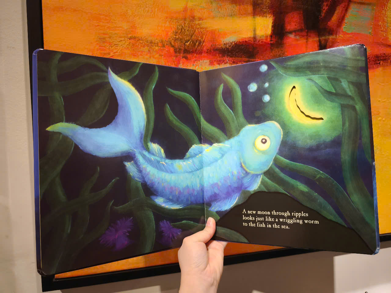The moon holds secrets for animals as well as for children. A fish looking at a crescent moon through the ripples of a stream thinks it is a writhing caterpillar. To butterflies, a crescent moon looks like a delicious banana. To mice, a half moon looks like cheese... In this picture book, with lines cut through it, the moon takes on many shapes, growing larger and larger until it shines full upon a little boy.