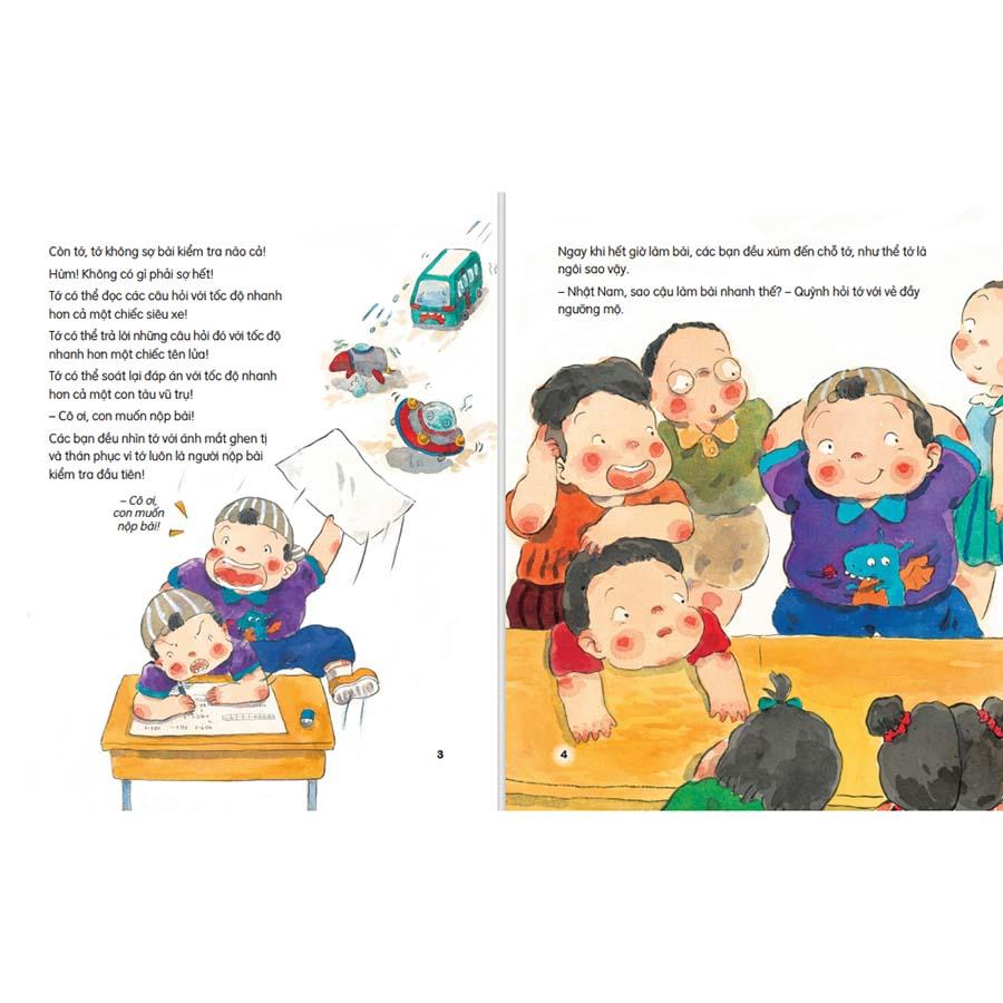 Cuốn Cẩn thận khi làm bài kiểm tra là câu chuyện của bạn nhỏ luôn đọc đề bài, làm bài và nộp bài kiểm tra nhanh nhất để được nhìn thấy ánh mắt ngưỡng mộ của các bạn. Nhưng sau đó, cậu lại vô cùng xấu hổ khi cô giáo trả bài kiểm tra. Cô giáo dẫn các bạn đến thế giới của các bài kiểm tra. Vì bất cẩn nên bạn nhỏ đã bị biến thành con ếch và phải trải qua nhiều thử thách để cậu trở lại thành người như trước. Qua đó, bạn nhỏ đã rút ra được bài học sâu sắc về sự cần thiết của việc đọc đề bài thật kĩ, làm bài thật cẩn thận và soát lại trước khi nộp bài.