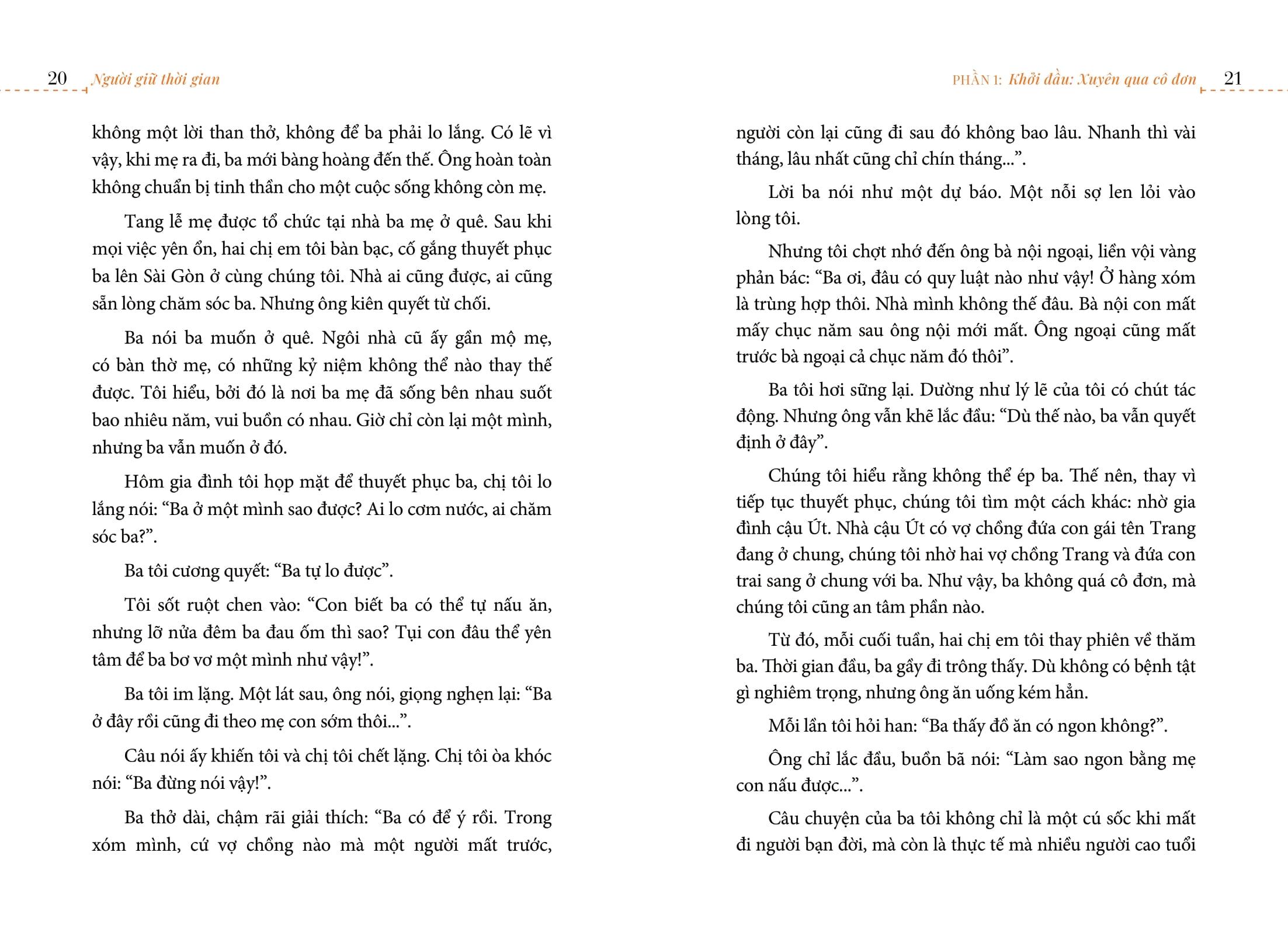 “Đọc sách, tôi bắt gặp hình ảnh của chính tôi, bắt gặp những câu hỏi đã từng lặng lẽ đi qua lòng m.ình: Mình đã đủ gần gũi với cha mẹ chưa? Đã thực sự hiểu cha mẹ muốn gì khi về già? Mình đang yêu thương cha mẹ theo cách họ cần hay chỉ theo cách m.ình quen? Chính vì vậy, tôi trân trọng Người giữ thời gian như trân trọng một tiếng thì thầm đầy cảm động về hành trình làm con, hành trình níu giữ những “vàng son” còn lại trong thời gian hữu hạn của cha mẹ”