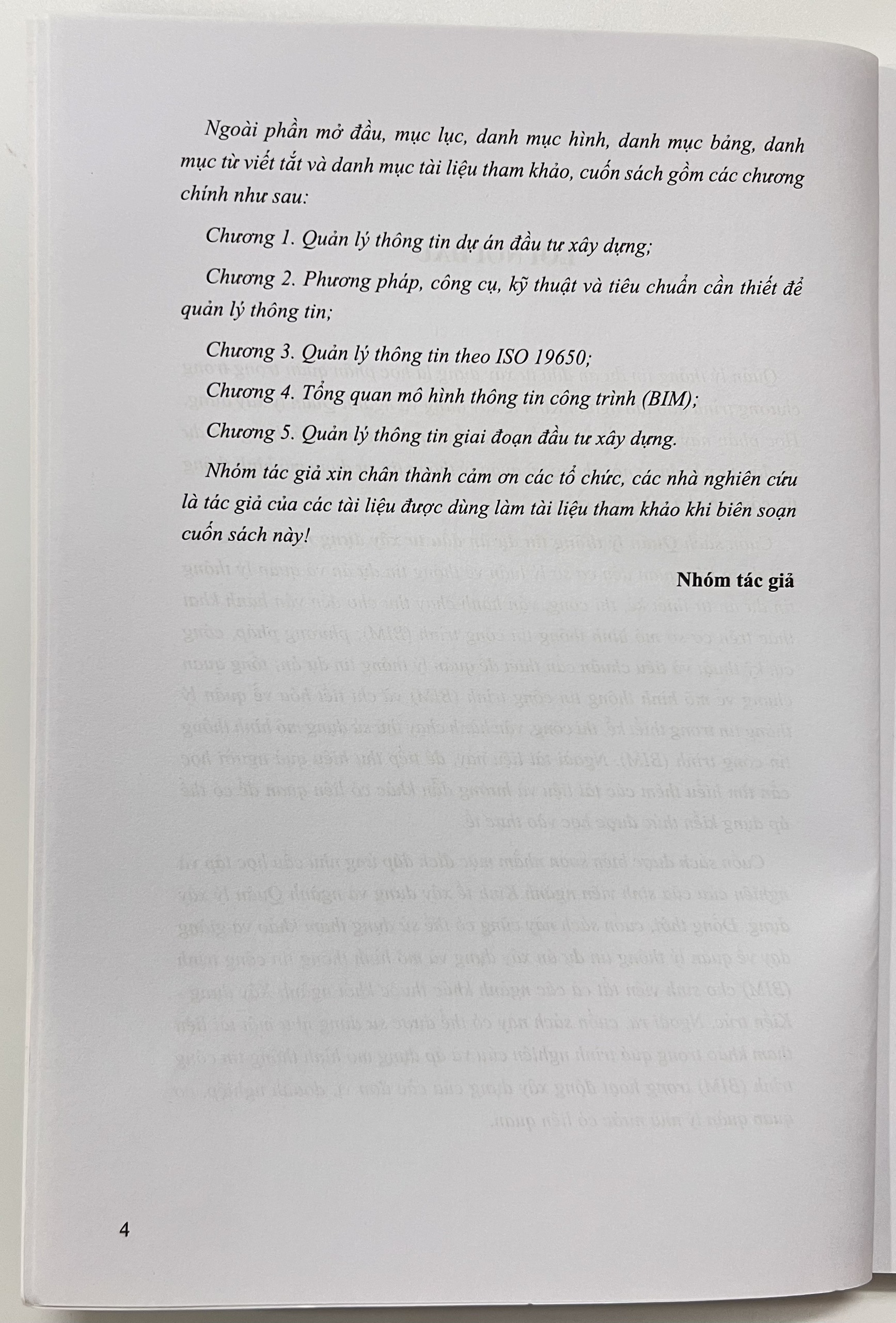 Cuốn sách được biên soạn nhằm mục đích đáp ứng nhu cầu học tập và nghiên cứu của sinh viên ngành Kinh tế xây dựng và ngành Quản lý xây dựng. Đồng thời, cuốn sách này cũng có thể sử dụng tham khảo và giảng dạy về quản lý thông tin dự án xây dựng và mô hình thông tin công trình (BIM) cho sinh viên tất cả các ngành khác thuộc khối ngành Xây dựng - Kiến trúc. Ngoài ra, cuốn sách này có thể được sử dụng như một tài liệu tham khảo trong quá trình nghiên cứu và áp dụng mô hình thông tin công trình (BIM) trong hoạt động xây dựng của các đơn vị, doanh nghiệp, cơ quan quản lý nhà nước có liên quan.