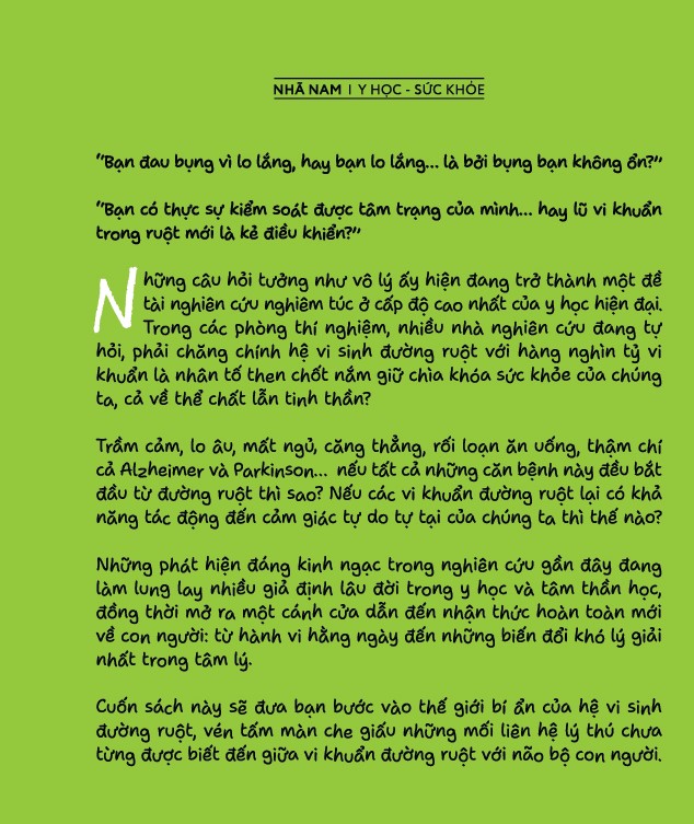 Nhà phát hành: Nhã Nam Nhà xuất bản: Dân Trí Tác giả: Giáo sư Gabriel Perlemuter Dịch giả: Huy Minh Số trang: 232 Kích thước: 14 x 20.5 cm Bạn đau bụng vì lo lắng, hay bạn lo lắng... là bởi bụng bạn không ổn?" "Bạn có thực sự kiểm soát được tâm trạng của mình... hay lũ vị khuẩn trong ruột mới là kẻ điều khiển?" Những câu hỏi tưởng như vô lý ấy hiện đang trở thành một để tài nghiên cứu nghiêm túc ở cấp độ cao nhất của y học hiện đại. Trong các phòng thí nghiệm, nhiều nhà nghiên cứu đang tự hỏi, phải chăng chính hệ vi sinh đường ruột với hàng nghìn tỷ vì khuẩn là nhân tố then chốt nằm giữ chìa khóa sức khỏe của chúng ta, cả về thể chất lẫn tinh thần? Trầm cảm, lo âu, mất ngủ, căng thẳng, rối loạn ăn uống, thậm chí cả Alzheimer và Parkinson... nếu tất cả những căn bệnh này đều bắt đầu từ đường ruột thì sao? Nếu các vi khuẩn đường ruột lại có khả năng tác động đến cảm giác tự do tự tại của chúng ta thì thế nào? Những phát hiện đáng kinh ngạc trong nghiên cứu gần đây đang làm lung lay nhiều giả định lâu đời trong y học và tâm thần học, đồng thời mở ra một cánh cửa dẫn đến nhận thức hoàn toàn mới về con người: từ hành vi hằng ngày đến những biến đồi khó lý giải nhất trong tâm lý. Cuốn sách này sẽ đưa bạn bước vào thế giới bí ẩn của hệ vi sinh đường ruột, vén tấm màn che giấu những mối liên hệ lý thú chưa từng được biết đến giữa vi khuẩn đường ruột với não bộ con người