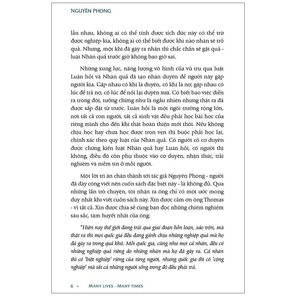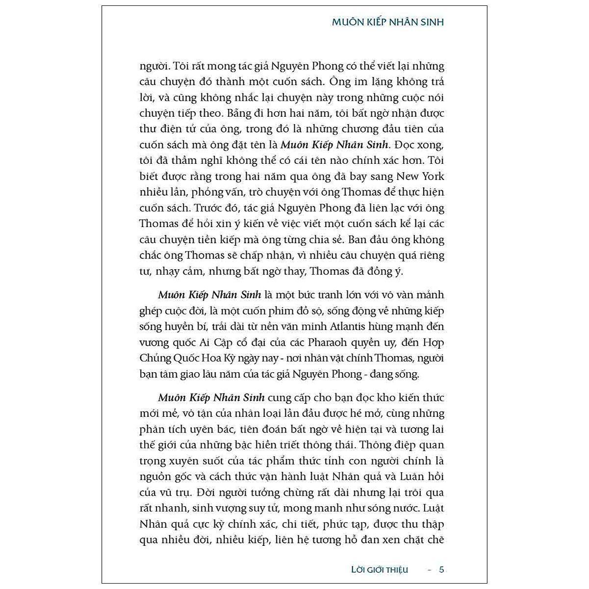 • Tương lai của mỗi con người, mỗi tổ chức, mỗi quốc gia và cả hành tinh này sẽ ra sao trong giai đoạn sắp tới là tùy thuộc vào thái độ ứng xử, nhìn nhận và thức tỉnh của từng cá nhân, từng tổ chức, từng quốc gia đó tạo nên. Nếu muốn thay đổi, cần khởi đầu bằng việc nhận thức, chuyển đổi tâm thức, lan tỏa yêu thương và chia sẻ sự hiểu biết từ mỗi người chúng ta trước. Nhân quả đừng đợi thấy mới ân quả là bảng chỉ đường, giúp con người tìm về thiện lương“ “Muôn kiếp nhân sinh” có hai khổ, bìa mềm khổ 14cmx 20.5cm, bìa cứng khổ 16x24cm ruột giấy Ford kem Nhật Bản 80 gsm, in 3 màu kèm 16 phụ bản màu. Cuốn sách được xuất bản bằng tiếng Việt trước khi được chuyển nhượng bản quyền cho các quốc gia khác trên thế giới.