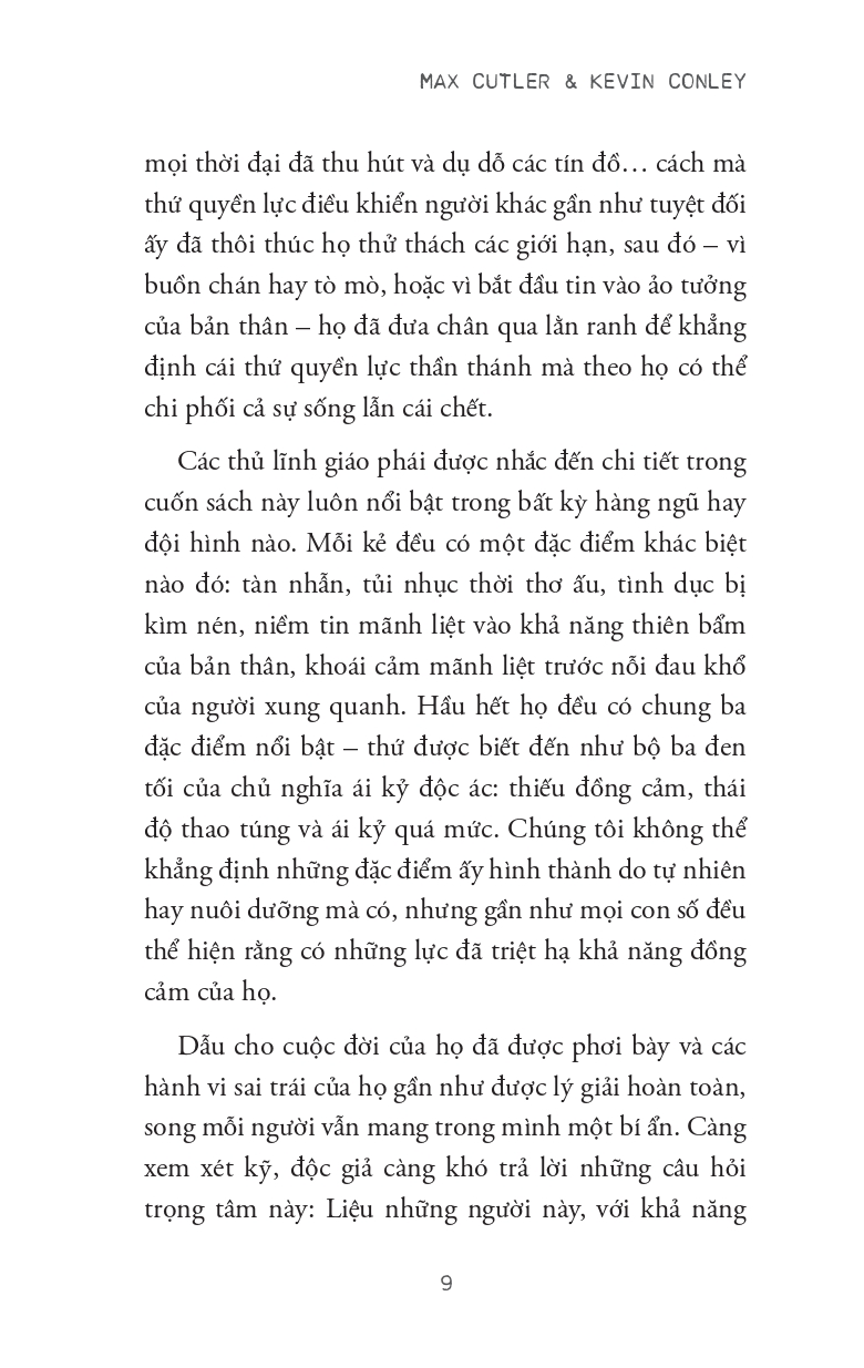 Cuốn sách được xây dựng dựa trên loạt podcast nổi tiếng Cults của Parcast – một trong những podcast dẫn đầu về đề tài giáo phái và tội phạm tâm lý học. Dưới góc nhìn cận tâm lý học và kể chuyện điều tra, Max Cutler và Kevin Conley tái hiện từng chi tiết trong cuộc đời và hành vi của các nhân vật như Charles Manson, Jim Jones, Keith Raniere, David Koresh,… những cái tên khiến cả thế giới rúng động bởi sự tàn nhẫn và khát vọng quyền lực không giới hạn.