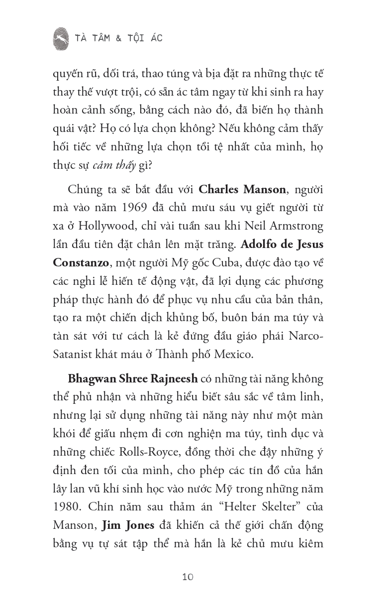 Với văn phong trực diện, giàu dữ liệu và phân tích sắc lạnh, Tà Tâm & Tội Ác không chỉ phù hợp với độc giả yêu thích điều tra, tội phạm, mà còn là tài liệu tham khảo thiết yếu cho những ai quan tâm đến tâm lý học tội phạm, hành vi cực đoan và cơ chế của thao túng xã hội.