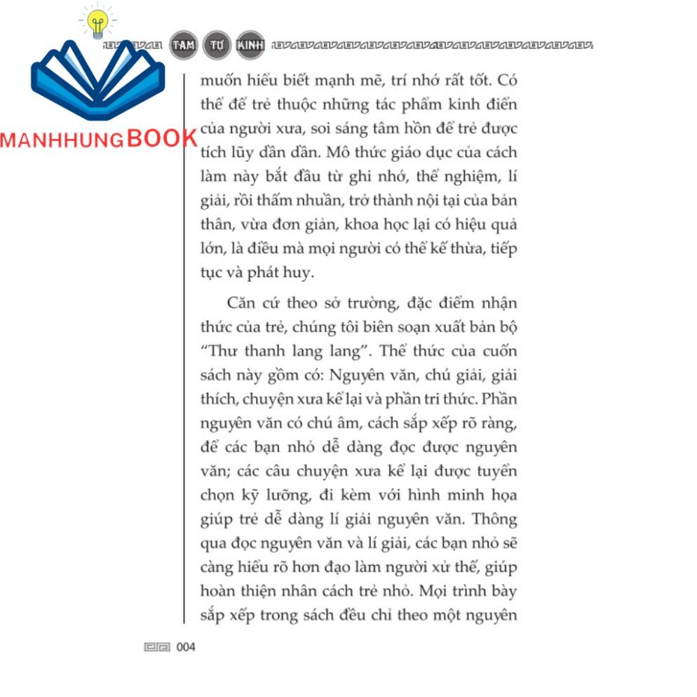 “Tam tự kinh” do Vương Ứng Lân đời Tống biên soạn, được bổ sung, hoàn thiện vào đời Minh, Thanh. Sách được biên soạn để dạy vỡ lòng cho trẻ, nhấn mạnh cần phải chuyên cần, chăm chỉ học tập, trau dồi kiến thức để duy trì bản tính thiện.